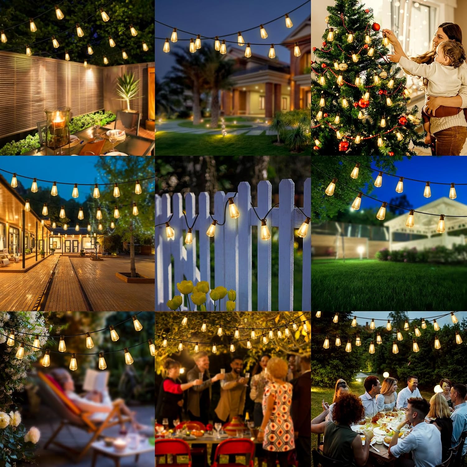 【OUTDOOR DECORATION LED STRING LIGHTS】This outdoor string light has a total length of 100FT, equipped with 50pcs E12 sockets and 52pcs ST38 led vintage Edison bulbs (2pcs spare bulbs), each bulb is 0.6W, compatible with dimmers (dimmers are not included), lovely shaped bulbs and warm color light, create a romantic and warm atmosphere for you.
