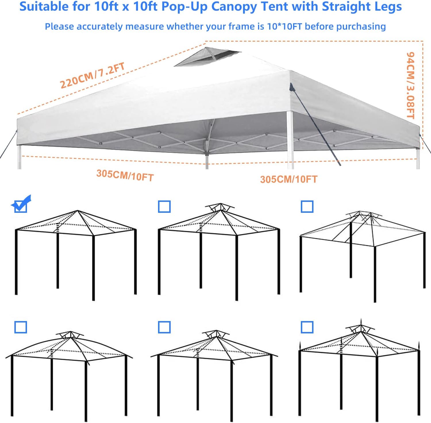 🌼🌼【Universal Replacement Cover】10x10ft (305x305cm)canopy top suitable for most of the standard canopy frames with 4 straight foot legs, a good choice for replacing your broken one or buy it as a backup. This canopy top measures 10′ W x 10′ D x 37″ H.(when placed on canopy frame).