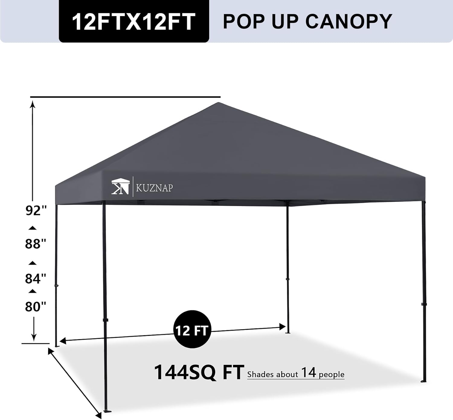 LARGE SHADING AREA: 12’x12’ canopy provides 144 sq. ft. of shade. The legs with pinch-free push button can be adjusted to 4 height levels. Can accommodate up to 15 people, perfect for family parties, backyards barbecue, tailgate grill, etc.