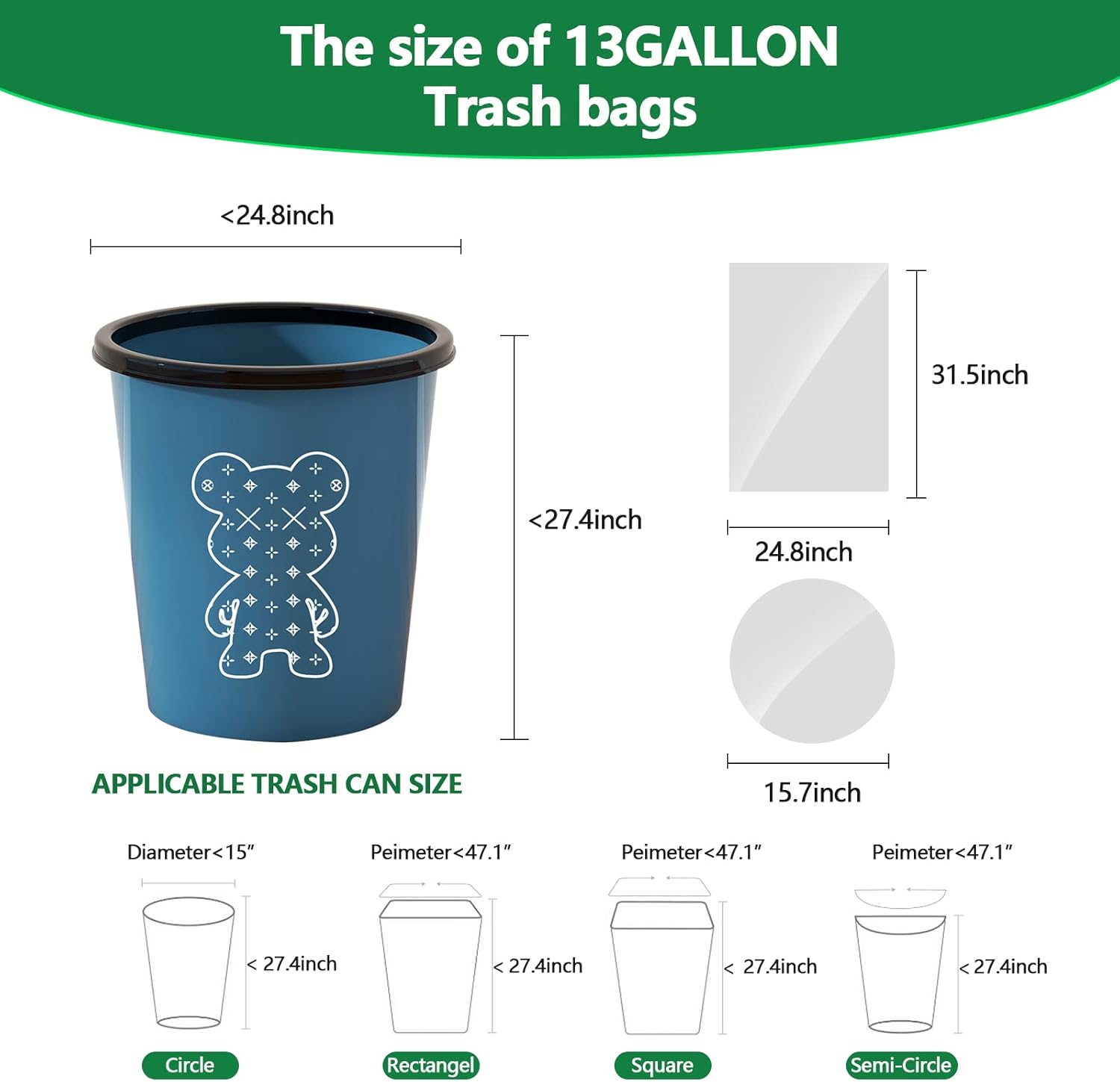 【STANDARD SIZE & SCENT FREE】Our translucent white trash can liners that measure 31.5inch x 24.8 inch and fit well in your tall garbage bags trash bins. We are 13 gallon size and the pack includes 4 perforated rolls of 12 bags each.These recyclable trash bags are unscented and a perfect size and they performed extremely well. Our 13 gallon compostable trash bags are more wide mouth in width.You can easily fold them over the top of the 15 gallon trash bags trash can!