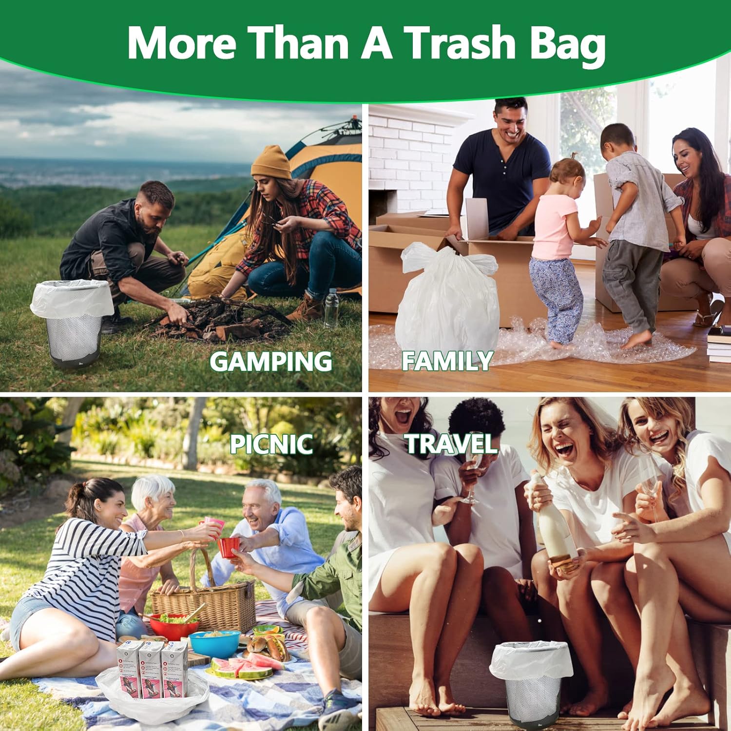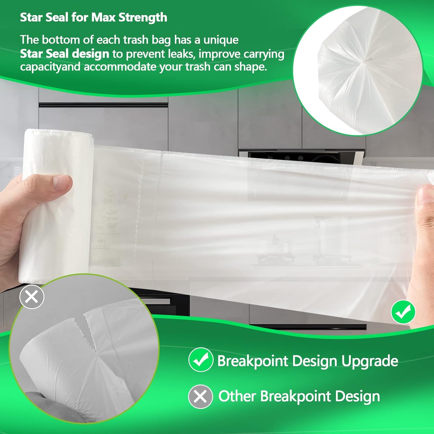 【OPTIMAL& HELPFUL PERFORATION DESIGN& MULTI-PURPOSE】The trash bags kitchen are substantial enough to hold up even under the most rigorous usage! Our kitchen trash bag perforations are perfectly fine! You can easily tear apart the trash bags tall kitchen without any damages!These tall trash bags tear cleanly at the perforations and are impressively durable!Our white garbage bags are not only for the office, kitchen, living room, bedroom, bathroom, yard, lawn, but also to camping, picnicing,traveling,on the go!