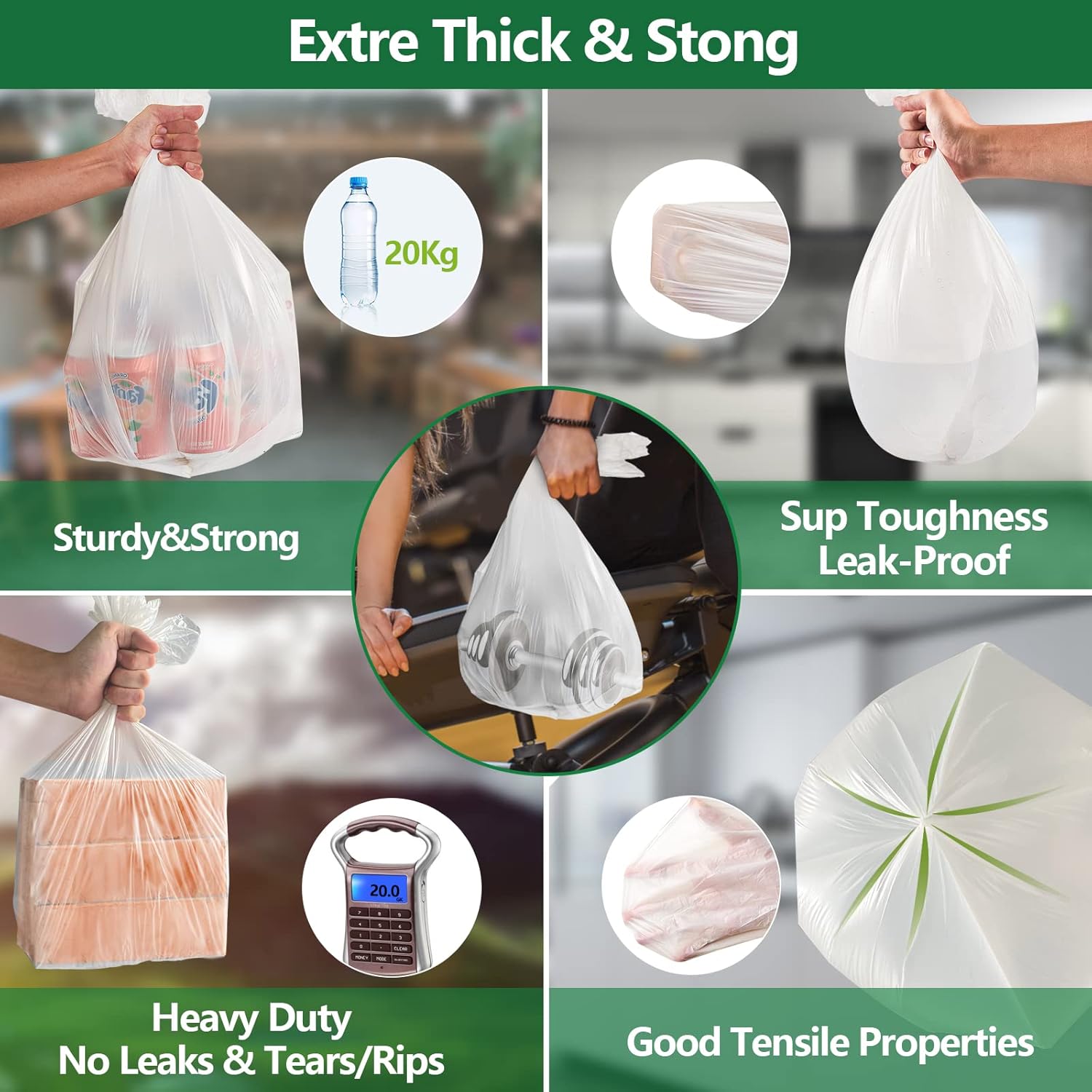 【BIODEGRADABLE & WHITE】Our kitchen trash bags 13 gallon are made of recyclable corn-based plastarch material (PSM) and are biodegradable and more environmentally friendly!Our garbage bags 13 gallon are unscented and they have a high capacity,not leak,tear,rip,nor punctures!The white trash bags are easy to view inside and tie closed!Exactly a value 13 gallon garbage bags!After filling up tall kitchen garbage bags to their capacity,they hold up very well and still enough space to tie 13 gal trash bags in a knot!