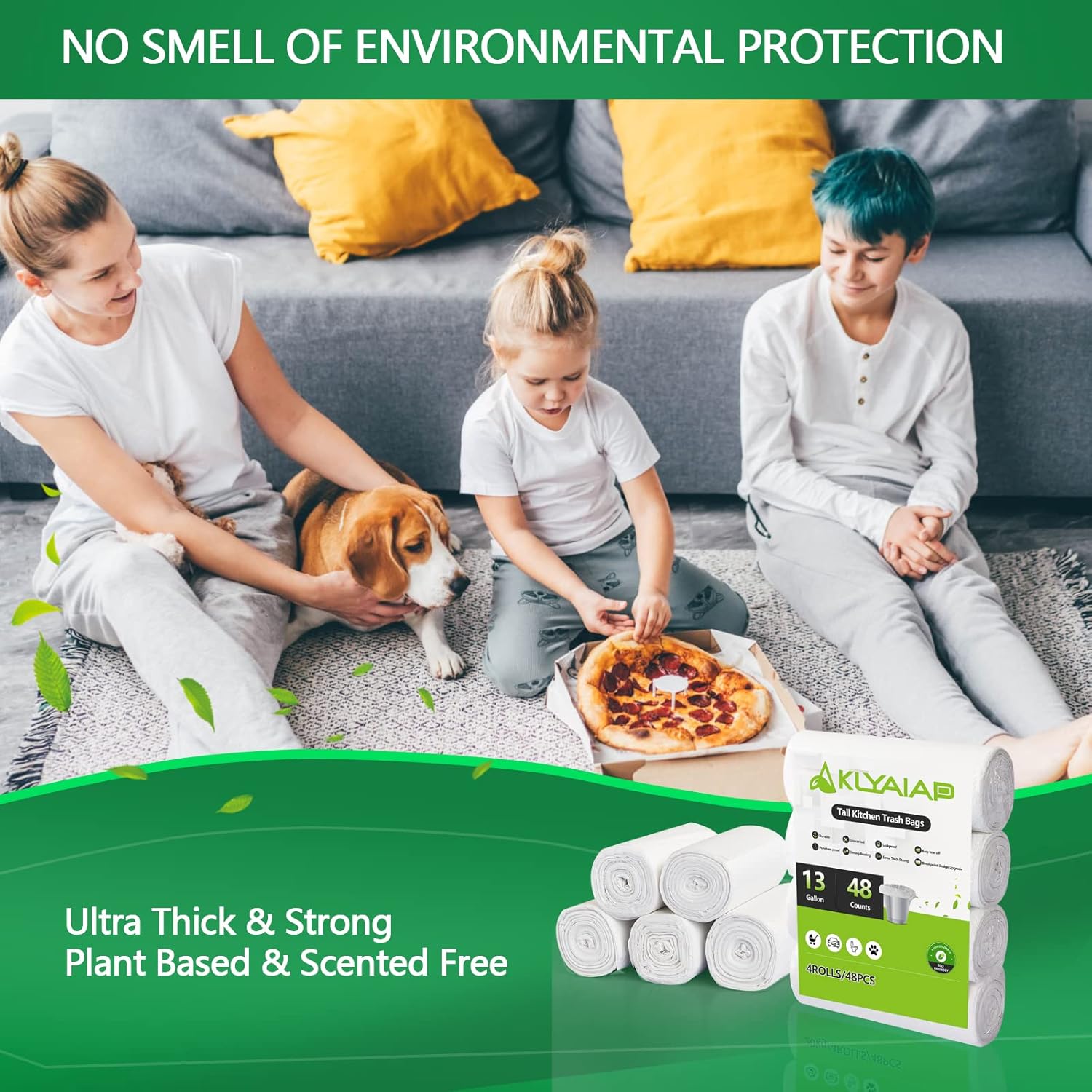 【THICKEN & STURDY & STRONG】Aklyaiap tall kitchen trash bags come with 48 counts in 4 separate rolls.In an attempt to compete to normal biodegradable trash bags,we have thickened our garbage bags 13 gallon tall kitchen along with improved octangle star-sealed bottom!They are easy to tear apart from the roll, sturdy and thick! They feel hefty and can hold a heavy duty weight! The trash bags 13 gallon are neatly presented and good household supply.Huge money saver over 13 gallon trash bags!