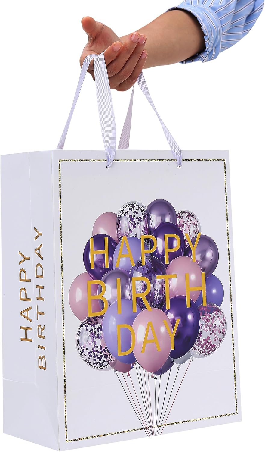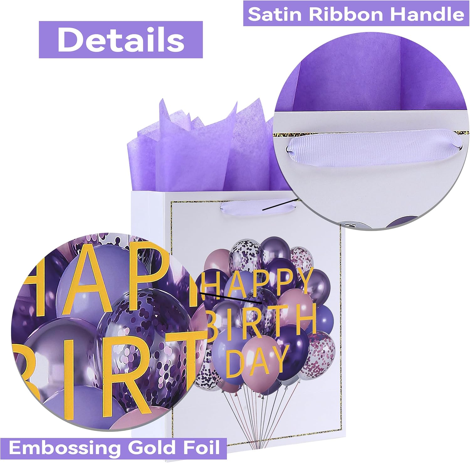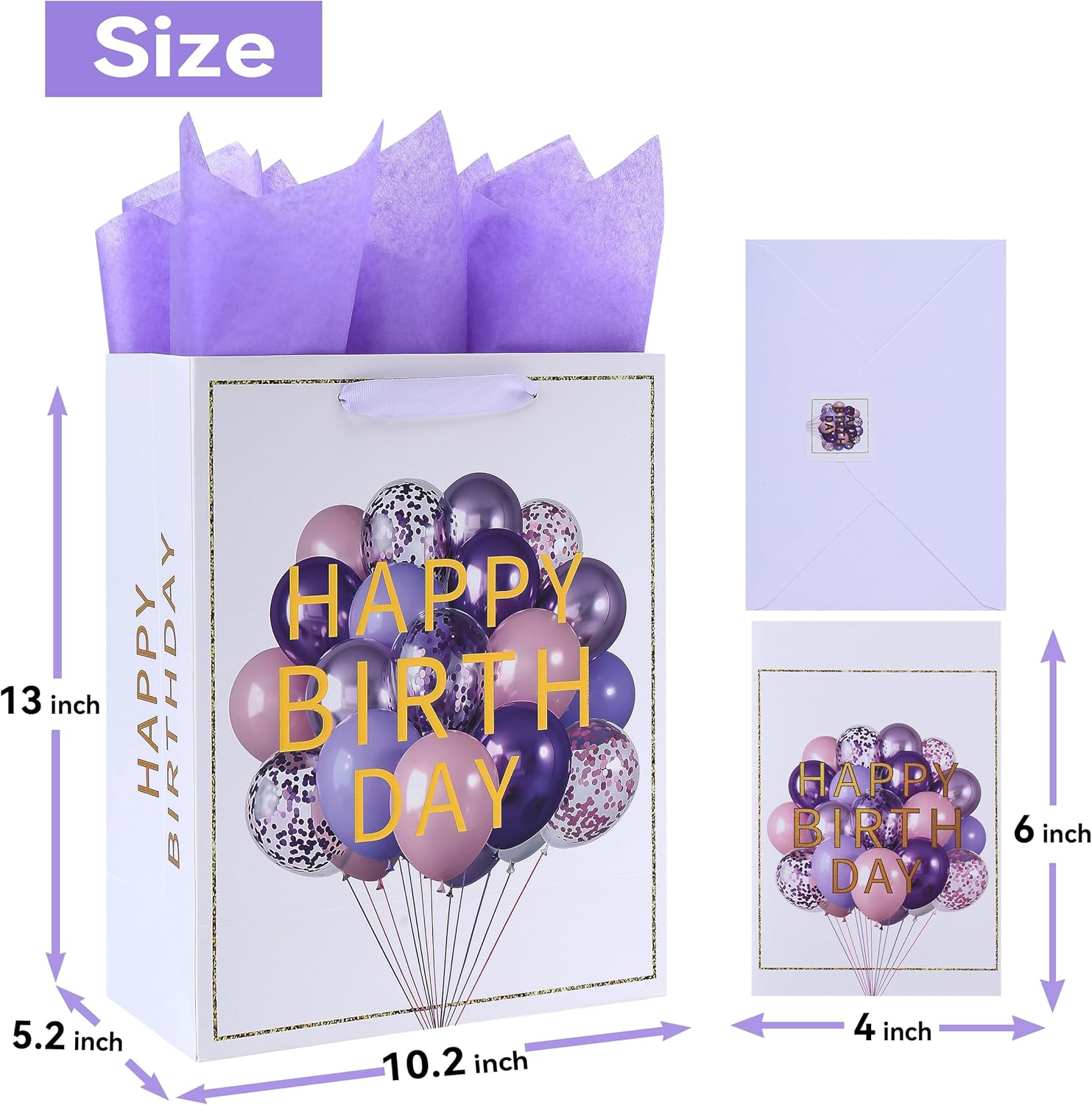 ULTIMATE PACKAGE:The package includes 1 large gift bag, 3 sheets of purple tissue paper for easy wrapping or decoration, and 1 greeting card of the same design with an accompanying envelope, enabling you to convey your sincere desires. Additionally, 2 stickers are included to enhance the sense of ceremony in your gift-giving experience. VERSATILE USE: This lovely gift bag is perfect for enhancing the atmosphere at birthday parties. It’s guaranteed to bring joy to friends, partners, colleagues, children, mothers, and fathers, making it an ideal choice for celebrating birthdays and other significant moments with loved ones. Whether it’s a child’s or an adult’s birthday party, this bag adds a touch of charm to your birthday celebrations. OPTIMAL SIZE:Measuring 10.2” W x 13” H x 5.2″ D, this sturdy large gift bag is perfectly sized for holding electronic devices, smartphones, tablets, clothing, shoes, handbags, designer accessories, and more. It’s versatile for gifting various items like chocolates, necklaces, bracelets, earrings, rings, books, art supplies, sports equipment, or cooking utensils. ECO FRIENDLY AND PREMIUM QUALITY:These eco-friendly gift bags are expertly crafted from high-quality paper materials, sourced from responsibly managed forests, ensuring both style and sustainability.