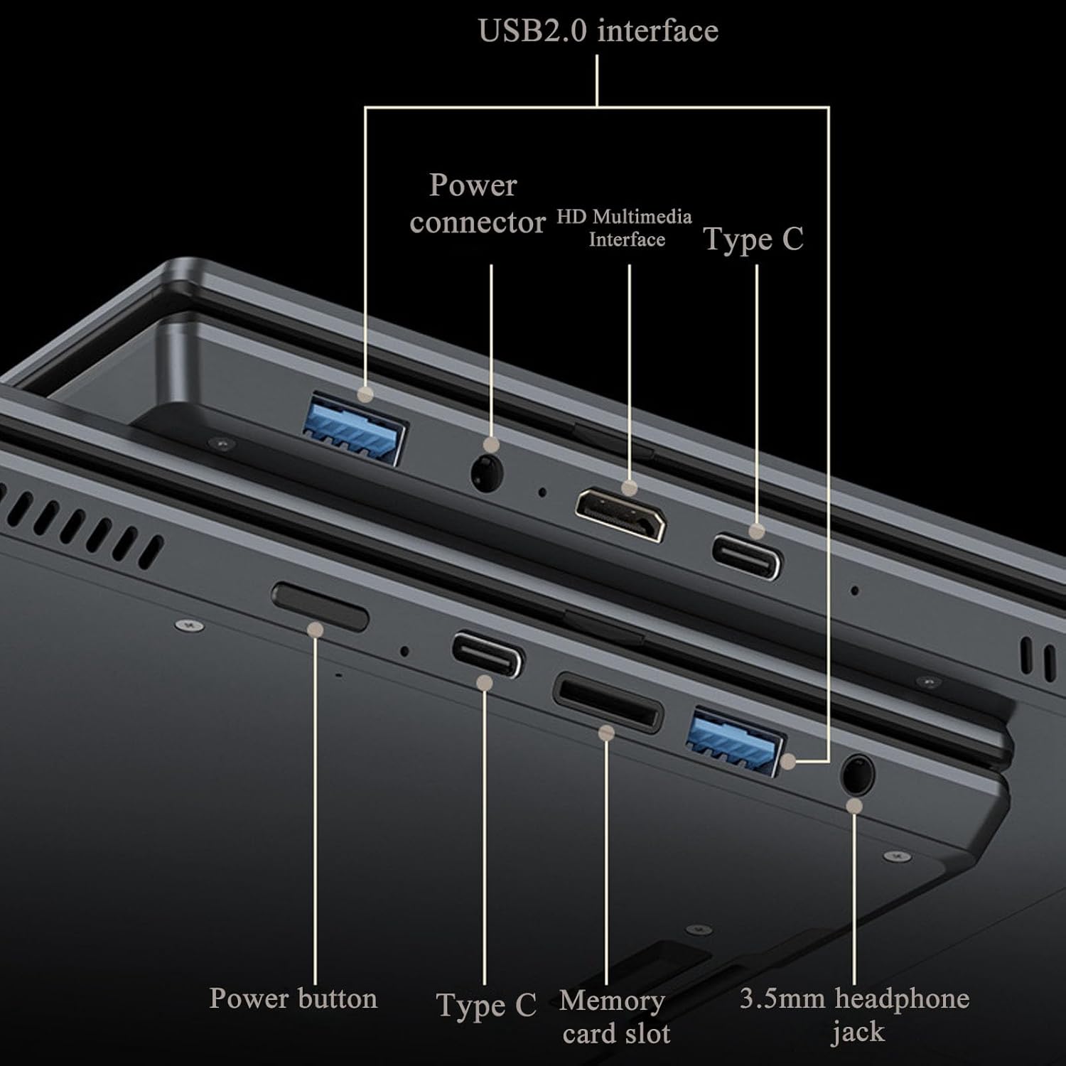 Ports: 2xUSB 3.0,1xPower ,1xHDMI,2xType C,1xHeadphone Socket;1xMemory Card Reader,1xDC Power Socket