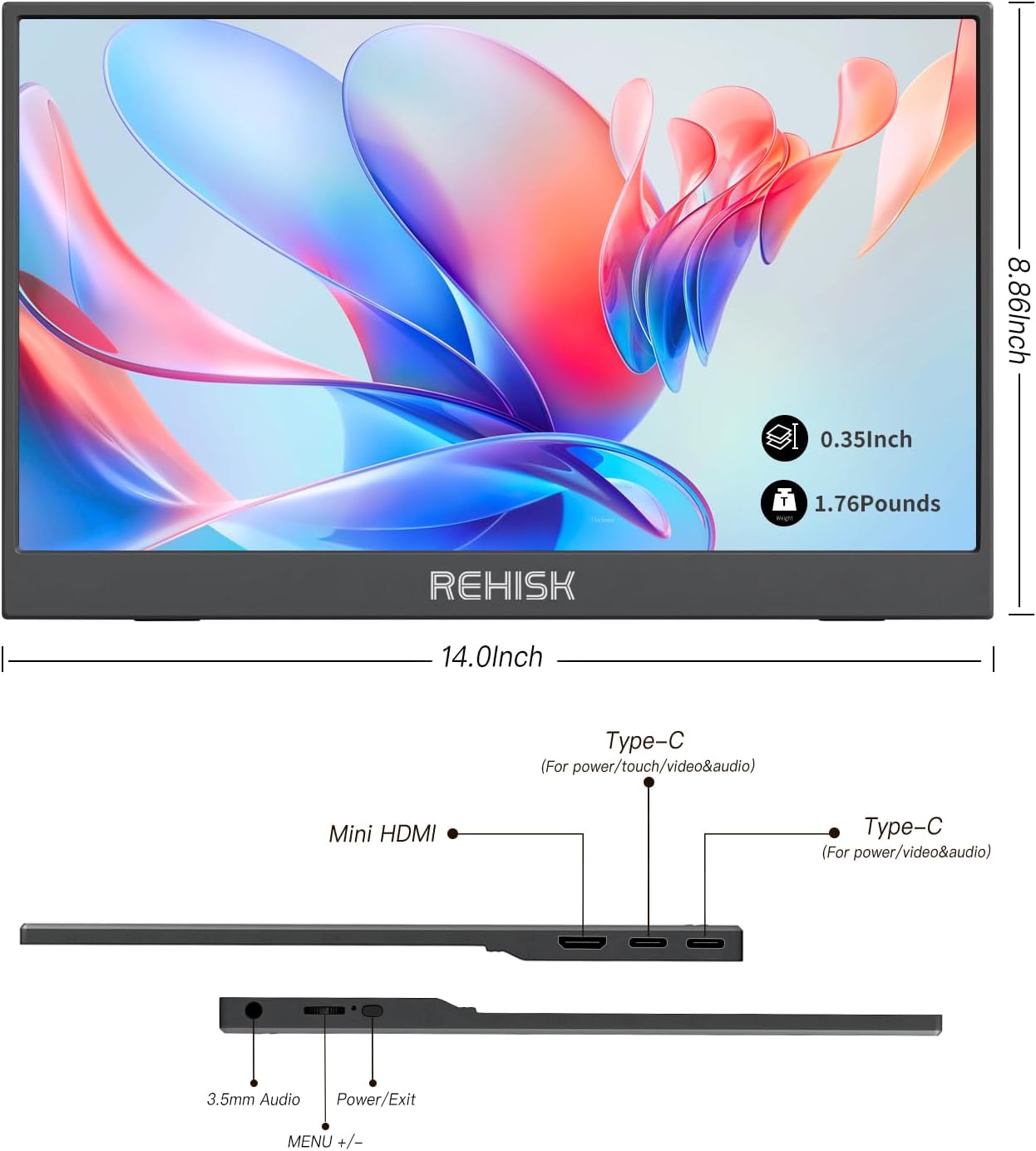 Vibrant FHD Display. Dive into vivid visuals with a Full HD (FHD) display featuring a 300-nit brightness level. Whether you’re watching movies, working on documents, or editing photos, the ReHisk portable monitor delivers sharp, clear images with true-to-life colors thanks to its IPS panel.