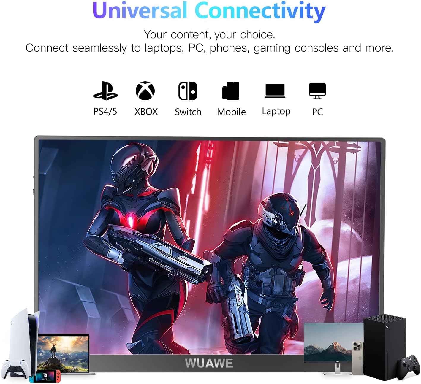 🌈 Plug and Play External Monitor: WUAWE portable screen just got even more convenient with plug-and-play functionality. Simply connect to power and display signal transmission using a USB Type-C cable – no drivers needed. With 2 full-featured Type-C ports and a mini HDMI port, easily connect to your laptop💻, PC🖥️, cell phone📱, Macbook, PS5/PS4🎮, Xbox, and Switch for seamless connectivity on-the-go. (⚡Note: Thunderbolt 3.0 or USB 3.1 Type C DP ALT-MODE required for compatibility)