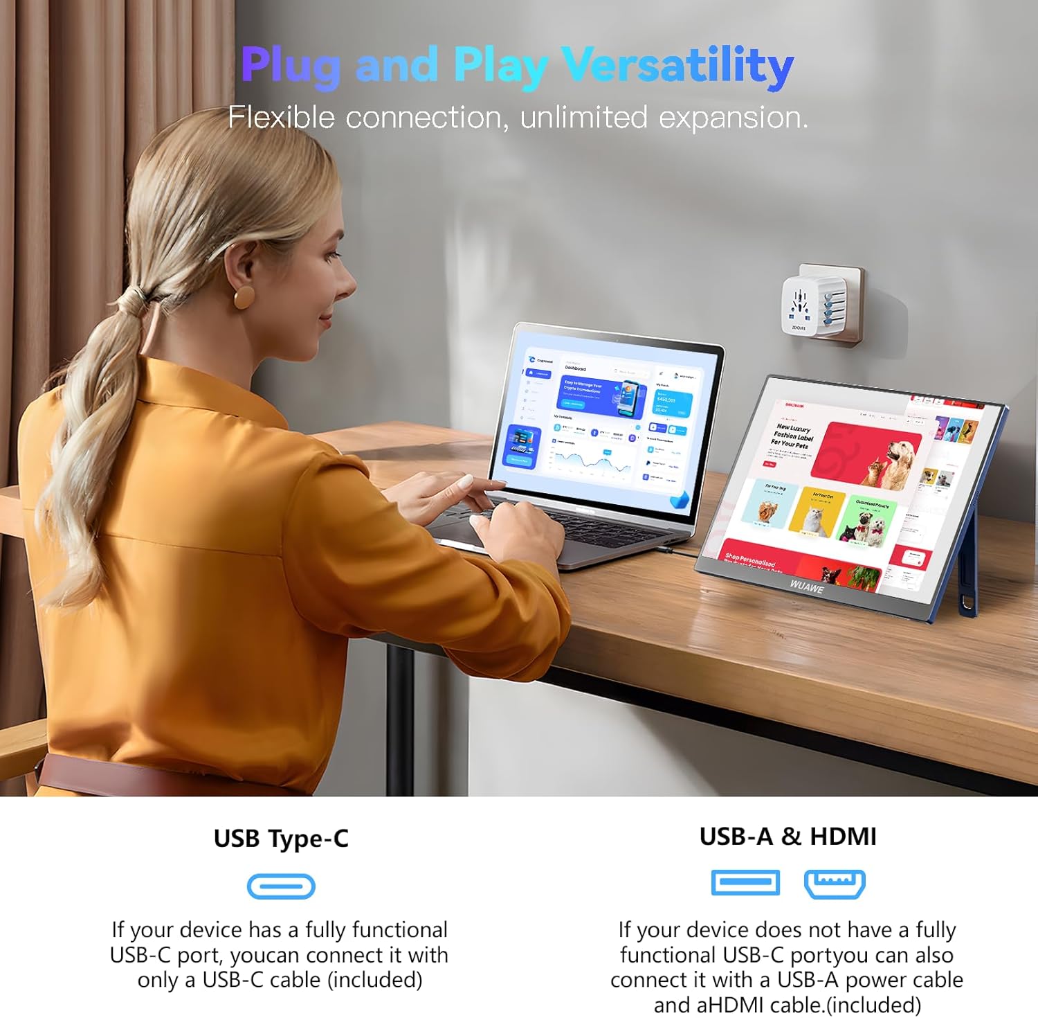 🌈 Plug and Play External Monitor: WUAWE portable screen just got even more convenient with plug-and-play functionality. Simply connect to power and display signal transmission using a USB Type-C cable – no drivers needed. With 2 full-featured Type-C ports and a mini HDMI port, easily connect to your laptop💻, PC🖥️, cell phone📱, Macbook, PS5/PS4🎮, Xbox, and Switch for seamless connectivity on-the-go. (⚡Note: Thunderbolt 3.0 or USB 3.1 Type C DP ALT-MODE required for compatibility)