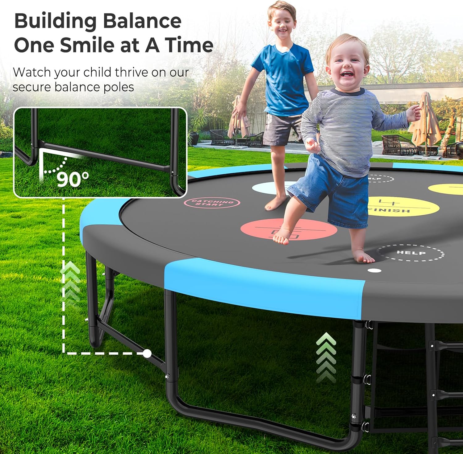【Uncompromised Safety】 Our trampoline features innovatively designed curved poles for comprehensive protection. Along with a 360° all-encompassing safety net, it guarantees unparalleled safety for your children, ensuring a worry-free jumping experience