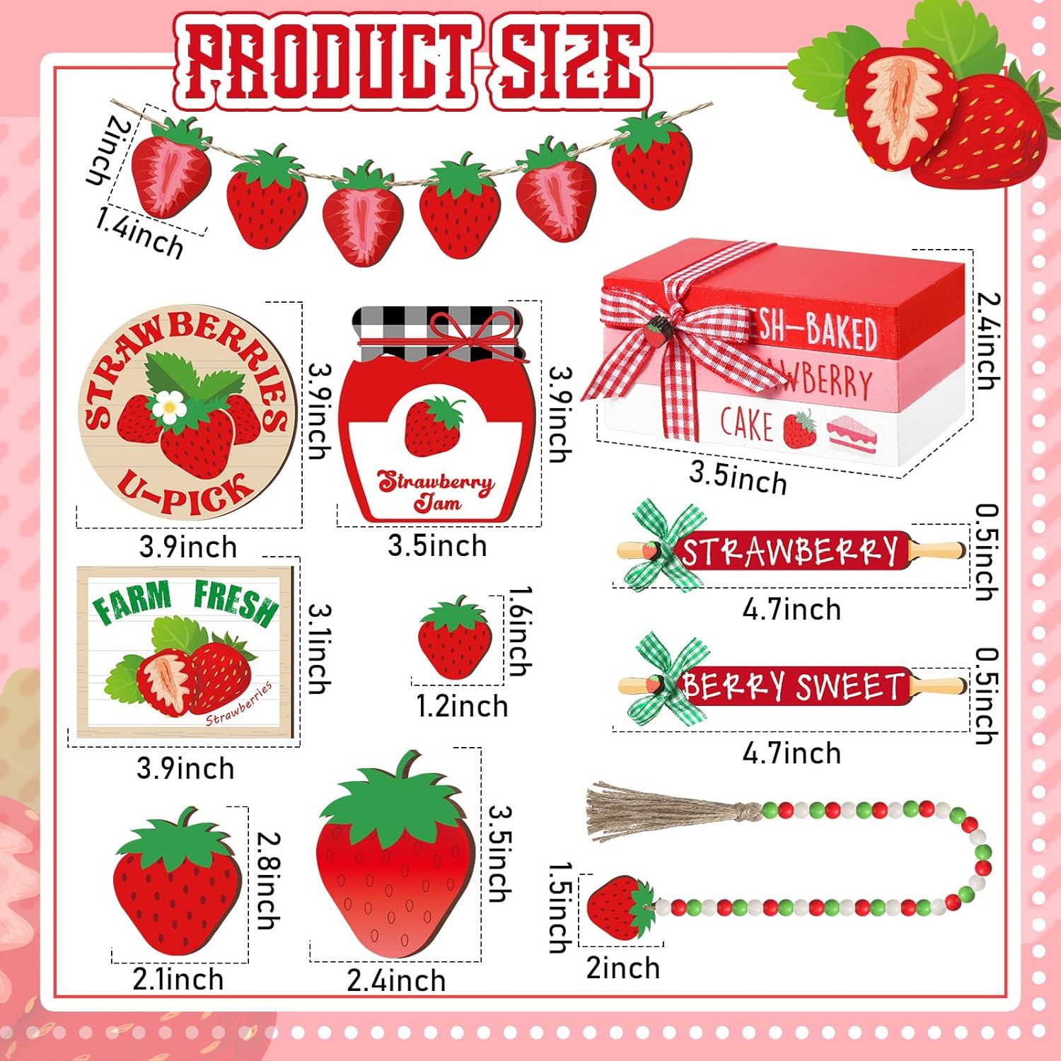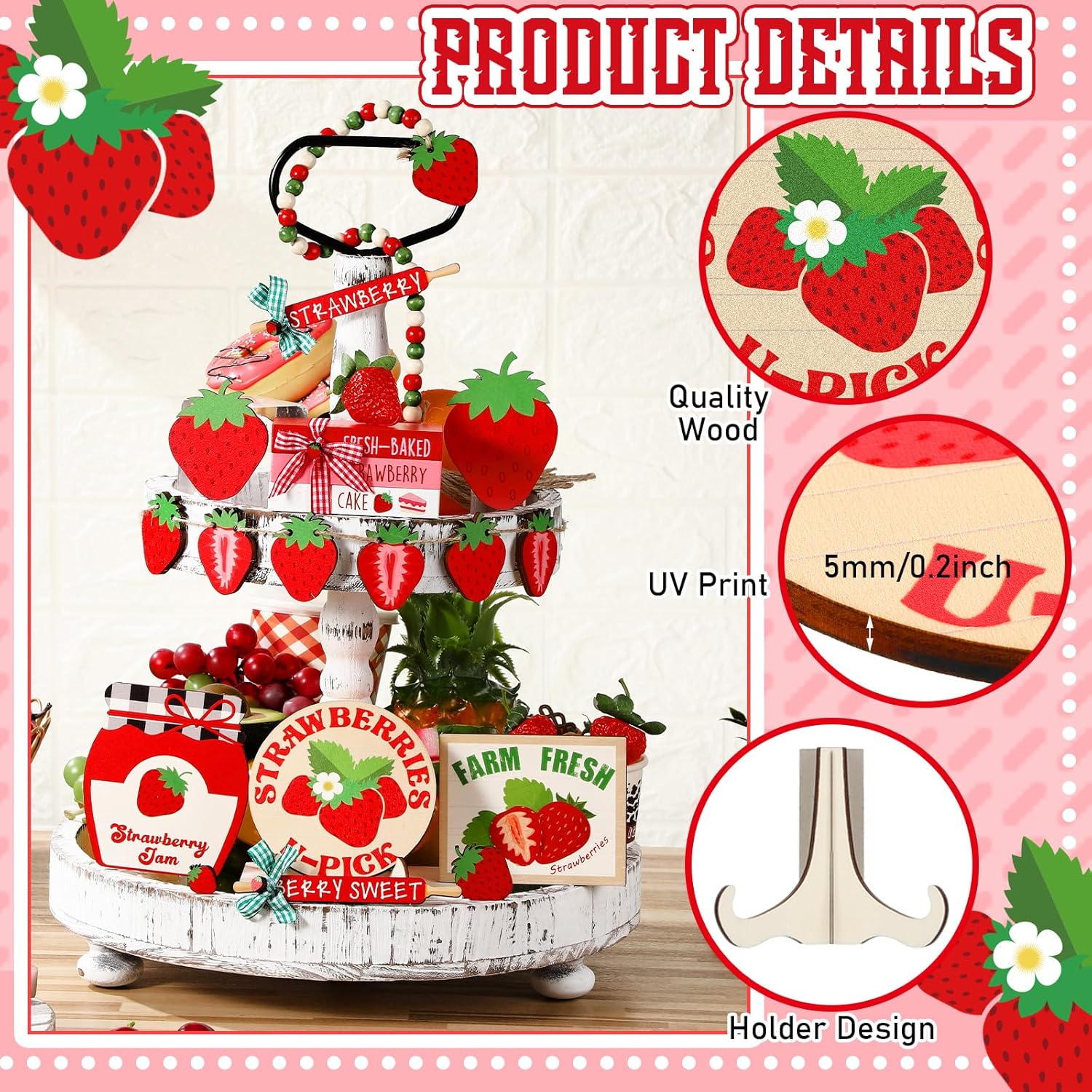 16 Pcs Summer Tiered Tray Decorations Set Strawberry Table Decor Farmhouse Summer Wood Sign Rustic Wooden Sweet Strawberry Centerpieces for Home Kitchen Tabletop Tiered Tray Decor