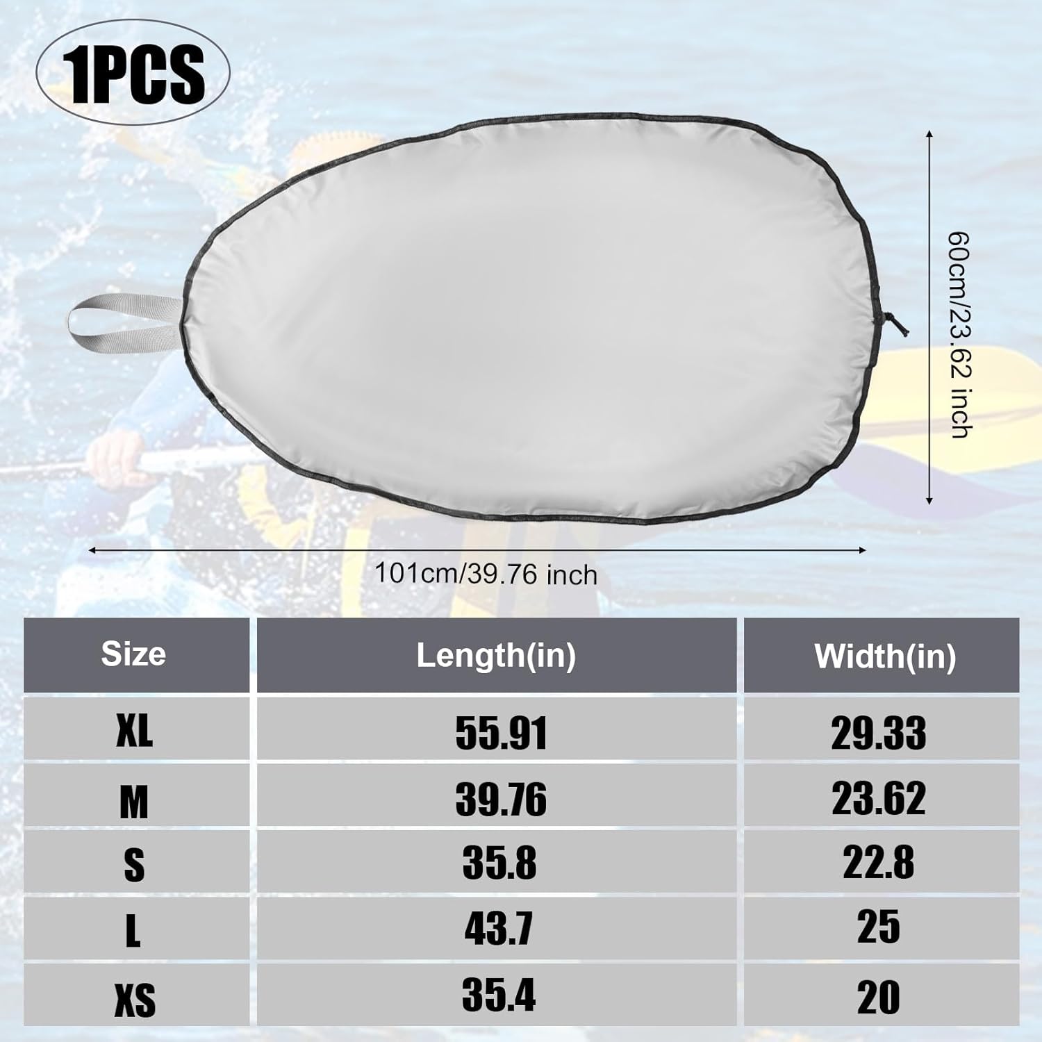 Product Size: The expanded size of the XL-sized kayak cockpit cover is 142×74.5cm/55.91×29.33 inch; and the expanded size of the M-sized kayak cockpit cover is 101x60cm/39.76×23.62 inch.