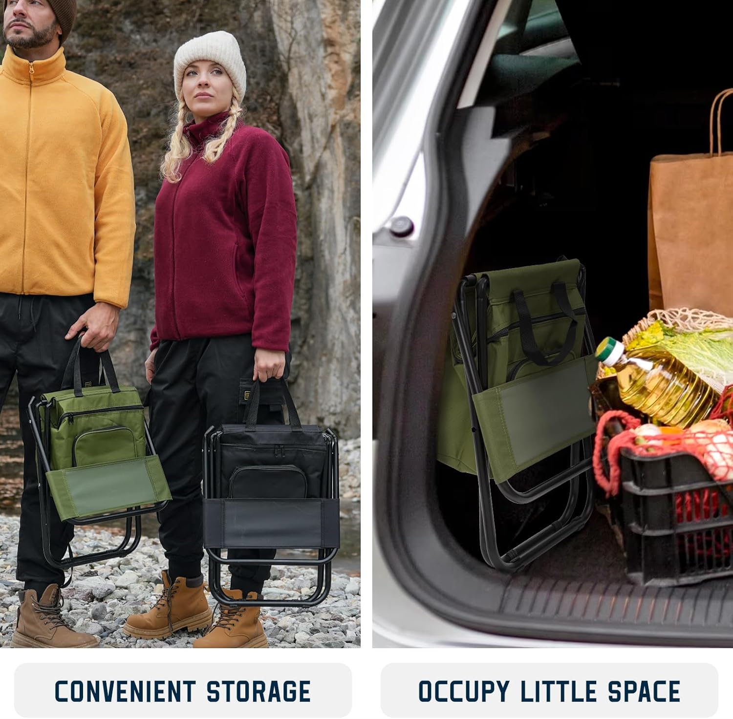 【MULTIFUNCTIONAL FOLDING CHAIR】The multifunctional small folding chair is ideal for various outdoor activities such as hiking, beach days, camping, picnics, fishing, travel, archery, and watching sports events. It features a cooler to keep things cold, a backrest for added comfort, and serves as a portable seat wherever you go. It can be used as a camping stool, fishing chair with a backpack, beach chair with a cooler bag, or a hunting stool.
