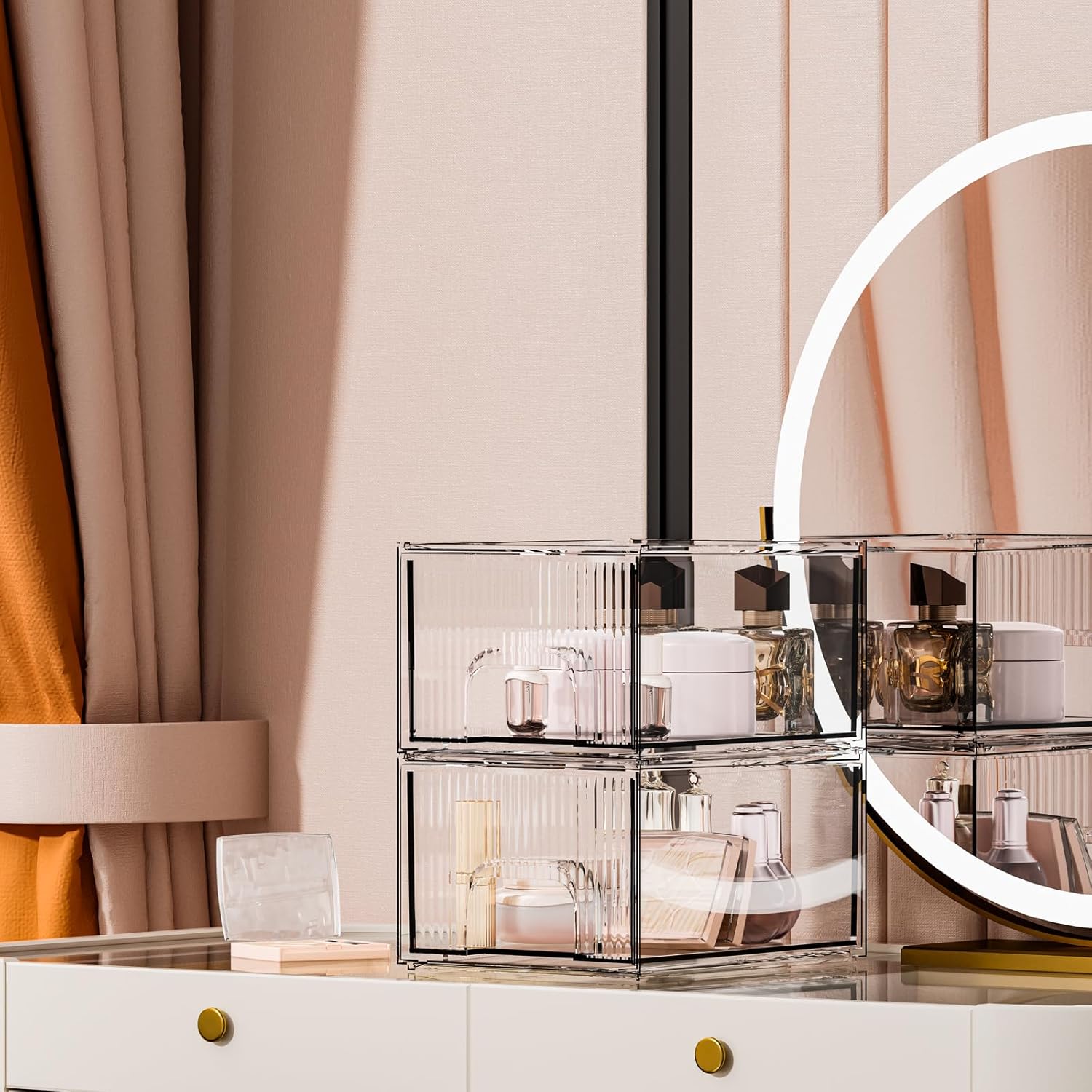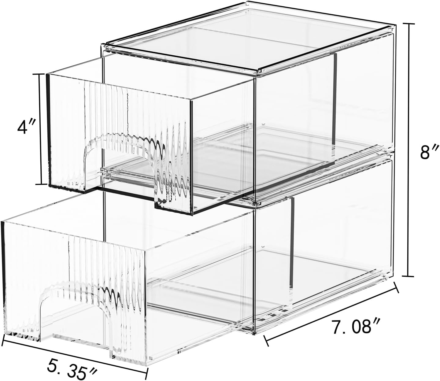 2 Pack Striped Stackable Acrylic Makeup Drawers Organizer, Clear Acrylic Cosmetic Storage Makeup Organizer Box with Drawers for Skincare Vanity Bathroom Pantry Organization Stackable