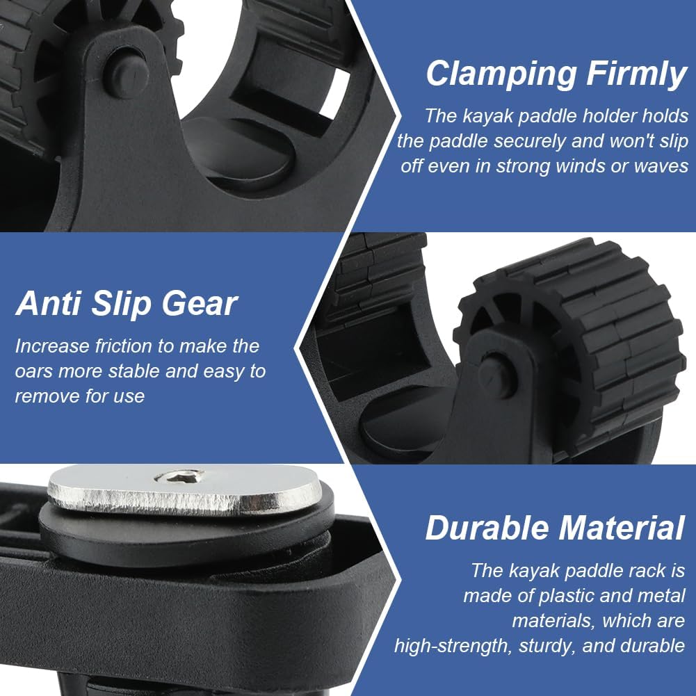 【DURABLE MATERIAL】The kayak paddle holder is made of plastic and metal materials, with smooth edges and no burrs, which will not scratch your paddle. It is high-strength, strong and durable, and can be used for a long time.