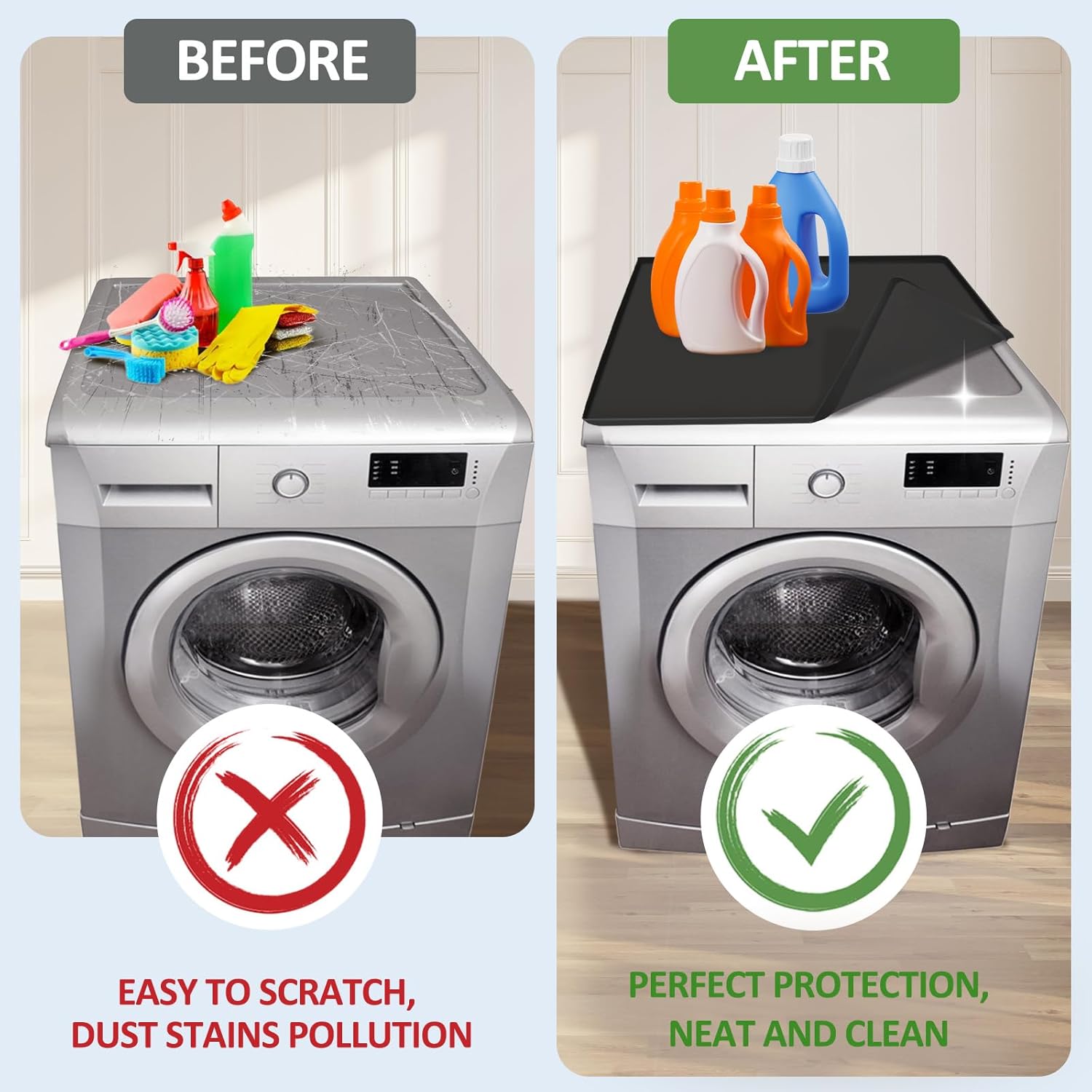 【Silicone Washer And Dryer Top Protector】Crafted from high-quality silicone, our washer and dryer cover boasts a soft, flexible, waterproof, and heat-resistant material that remains unchanged under high temperatures. Effectively safeguard your washing machine or dryer’s top surface from unknown liquid spills and scratches caused by unfamiliar objects. Protect your washer and dryer from sunlight and dust, extending its lifespan.