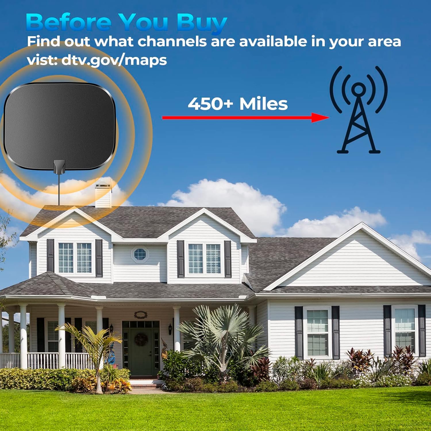 📡【450+ long Miles Long Range TV Antenna】450+ Miles signal reception range for more channels. The new technology equip with 2024 Enhance ic chip & HIGH-QUALITY signal amplifier filters out cellular and FM signals, which can bring more clear pictures, lower noise and access to broadcast signals easily.