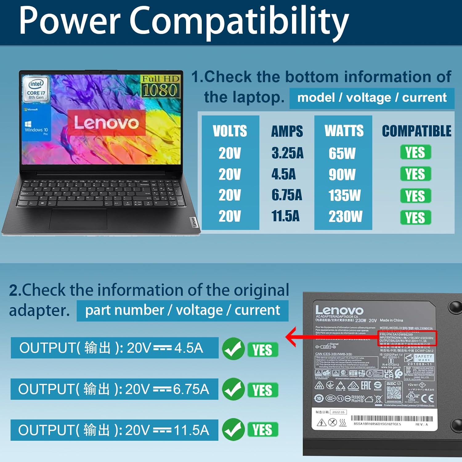 【COMPATIBLE MODELS】Fit for Lenovo Legion 5 Charger for Lenovo LOQ 15 16 Legion 7 5P C7 S7 Y540 Y545 Y740 Y730 Y900 Y910 Y920 Y7000 Thinkpad P1 P73 P53 P72 P52 P51 P70 Laptop – It will not work properly If your device requires over 230W