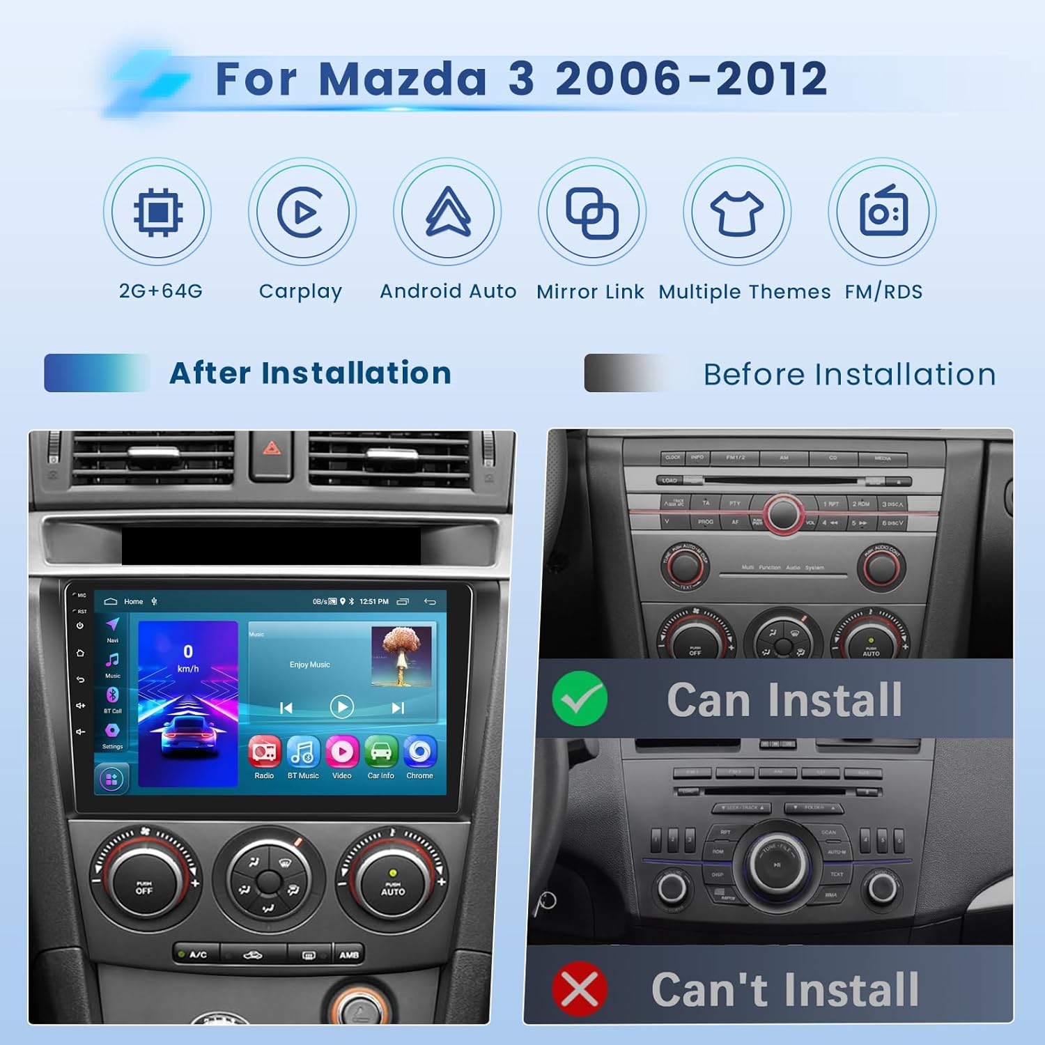 2+64G Android 13 CarPlay Car Stereo Radio for Mazda 3 2006-2012, 9” HD Touch Screen Compatible with Android Auto, AHD Backup Camera, Mirror Link, GPS, WiFi, FM RDS