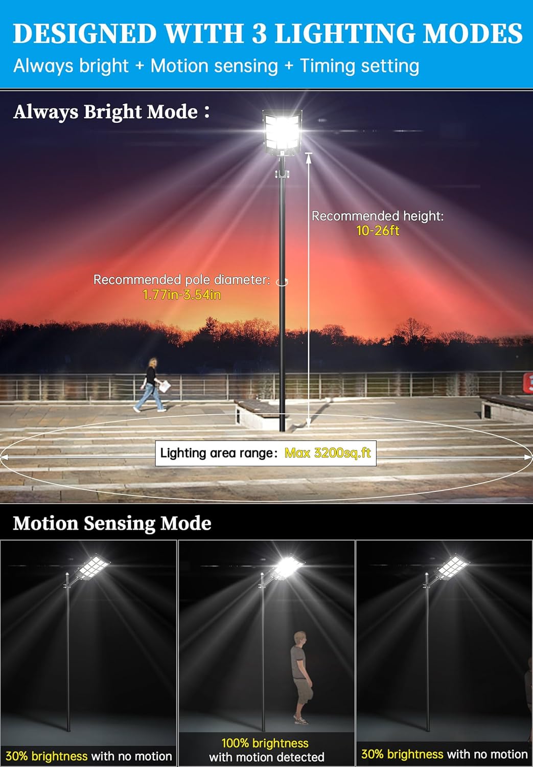 【 3 Lighting Modes & Intelligent Control】 — The solar flood lights provide 3 lighting modes for you to set. Mode 1: Always bright, Mode 2: Motion sensing, Mode 3: Timing setting. Provide 3 Timing sets: 3H/5H/8H. You can also adjust the brightness through remote control. 10%-100% levels of brightness that can be adjusted. Best Choice for commercial lighting and home lighting.