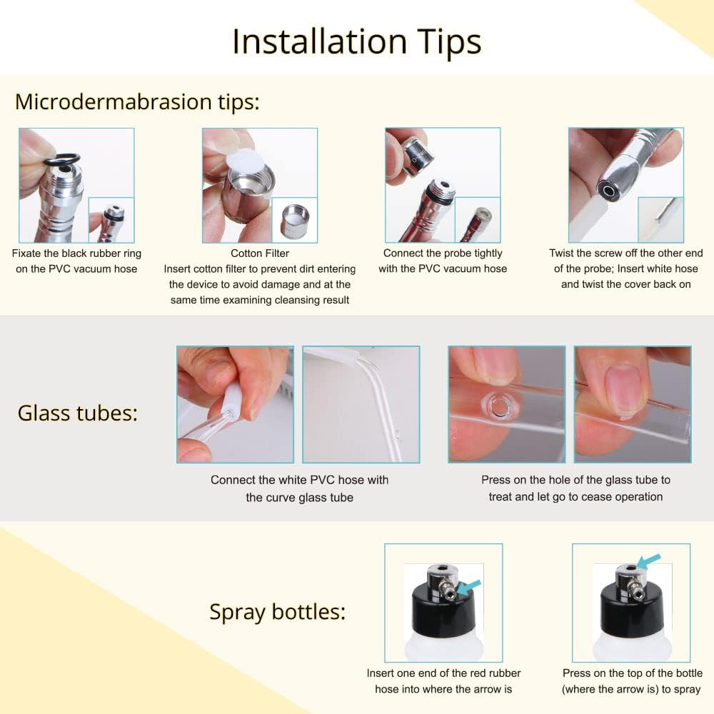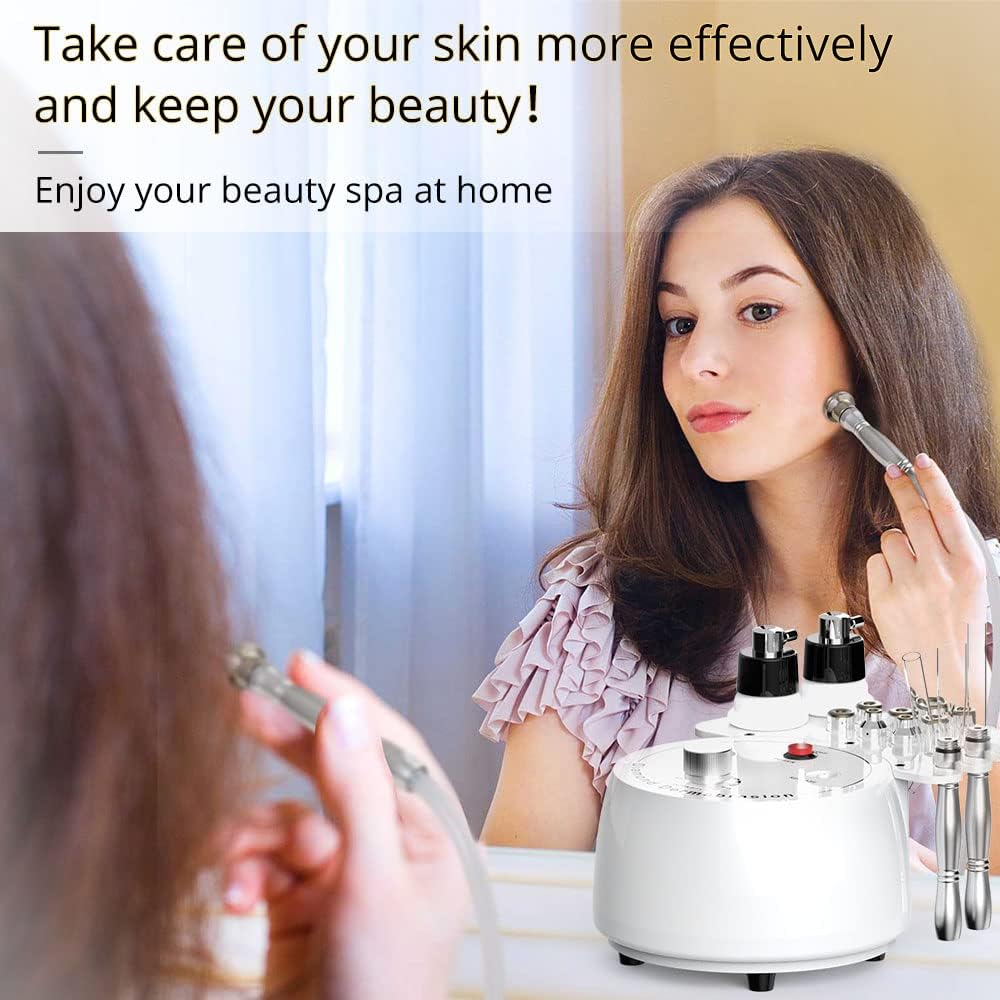 【3 in 1 Face Care】Microdermabrasion Machine have 3 function ①The Diamond Microdermabrasion② Vacuum function③ Spray function. (3 Aluminum wands, 9 Daimond head tips, 2 Spray bottles, 3 Glass tubes)