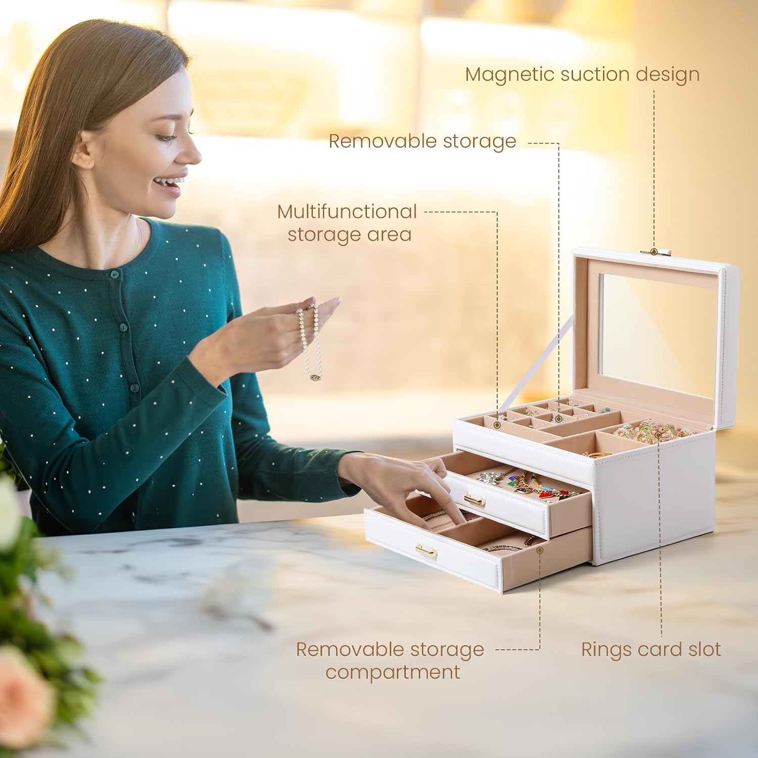 3 Layer Jewelry Box, Jewelry Boxes & Organizers, Jewelry Holder Organizer With Glass Lid, Jewelry Organizer for Big and Small Jewelry, Earring Organizer, 2 Drawers Jewelry Boxes for Women