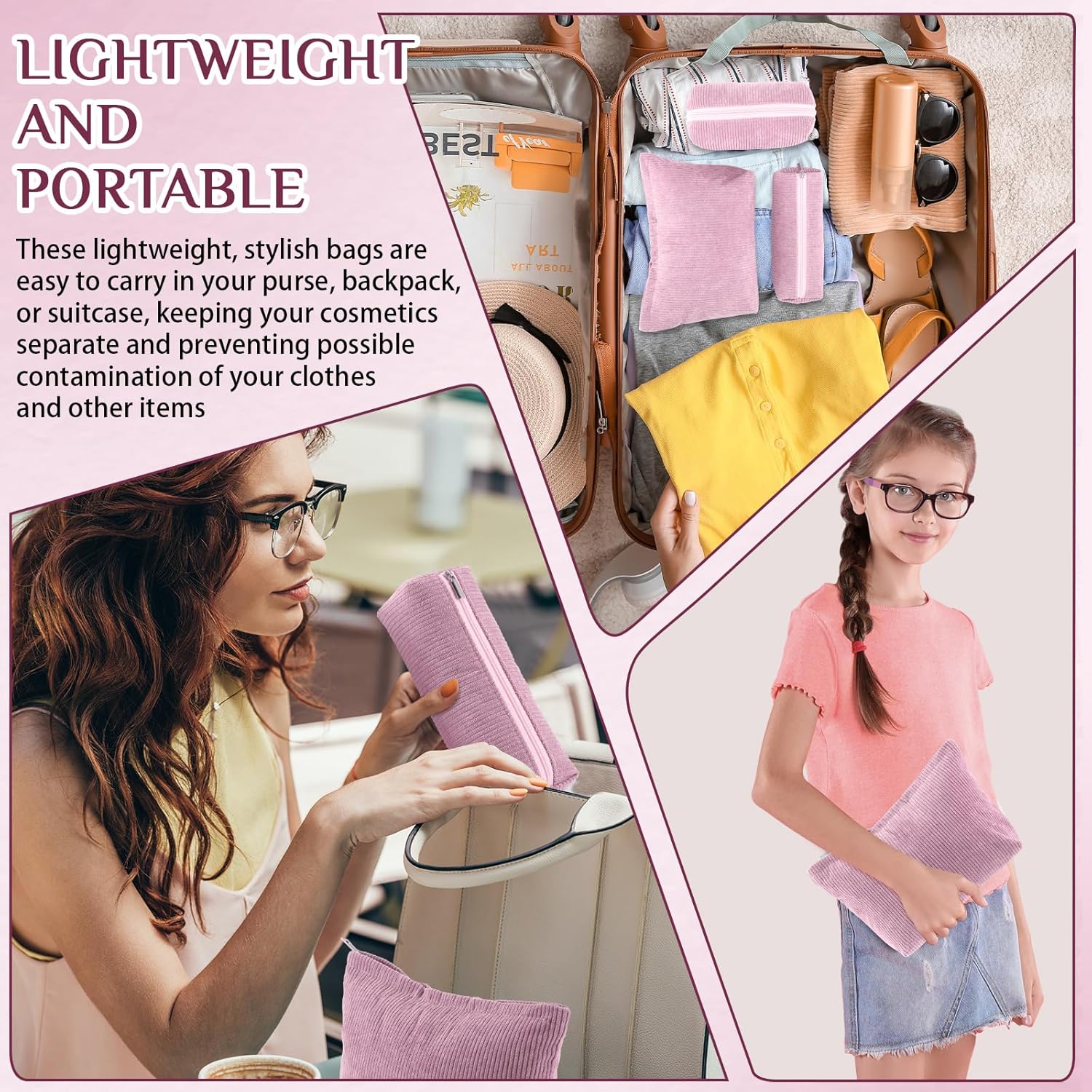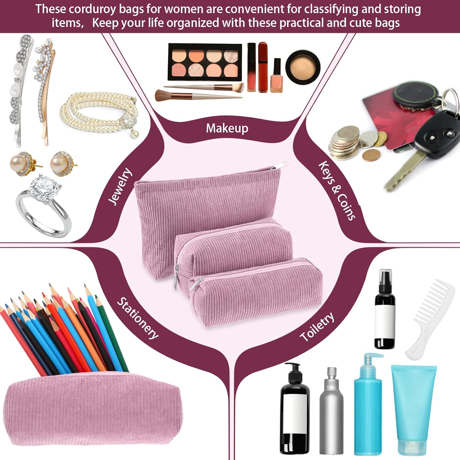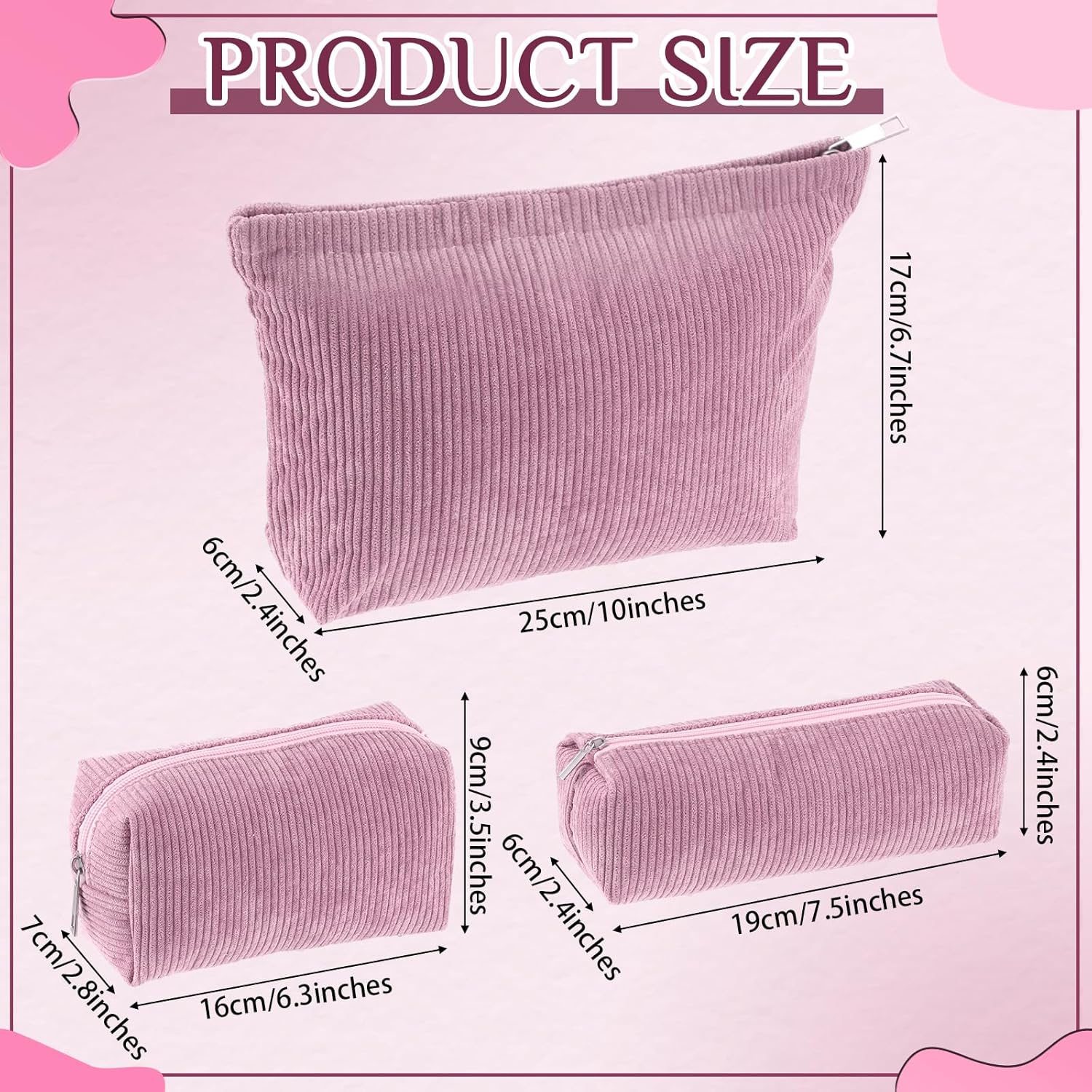 Material and Attractive Design: the makeup and toiletry travel bag set is mainly crafted from quality corduroy material, ensuring high durability and prolonged service life; The bags feature solid rose pink color design in different sizes; This makes them compatible with various styles of outfits