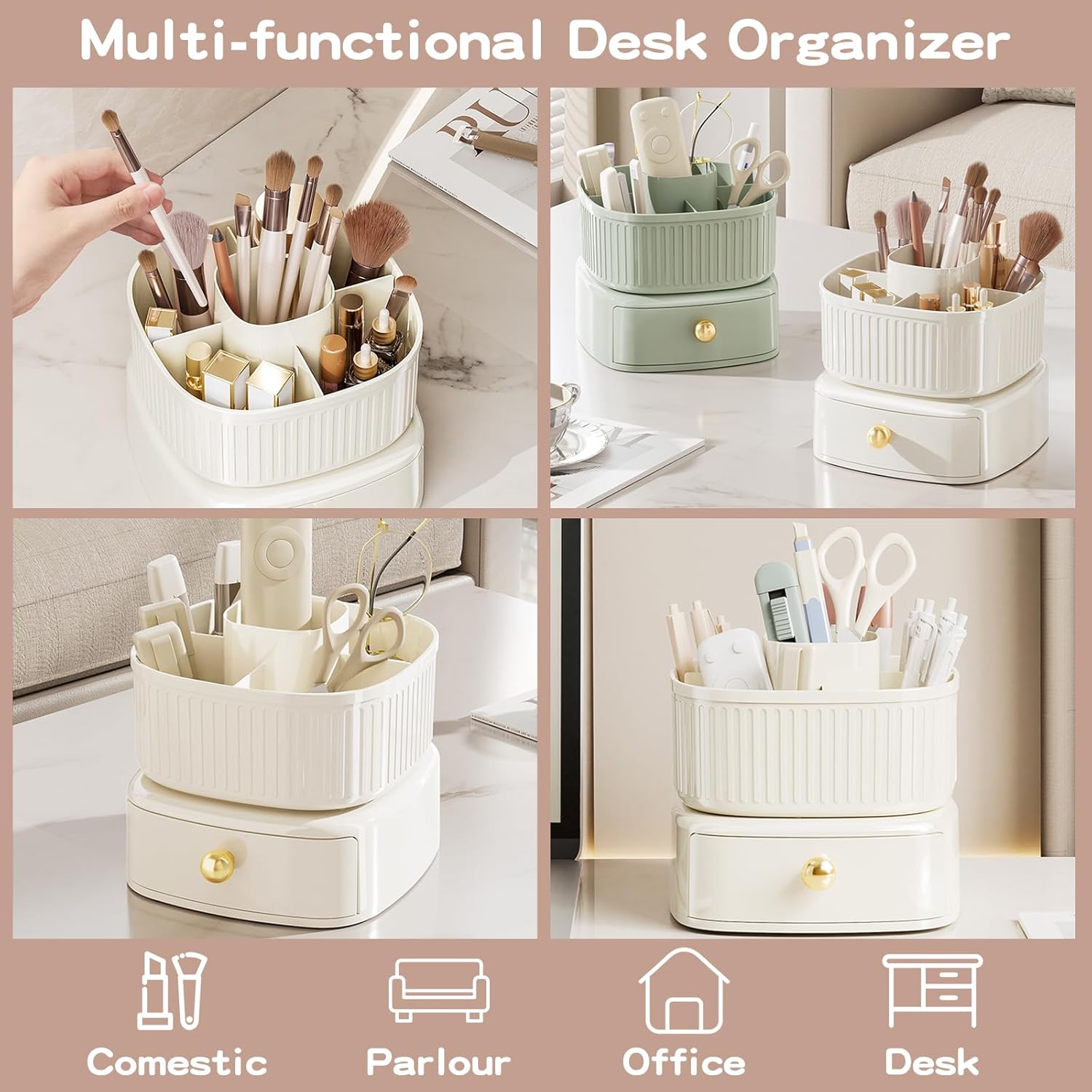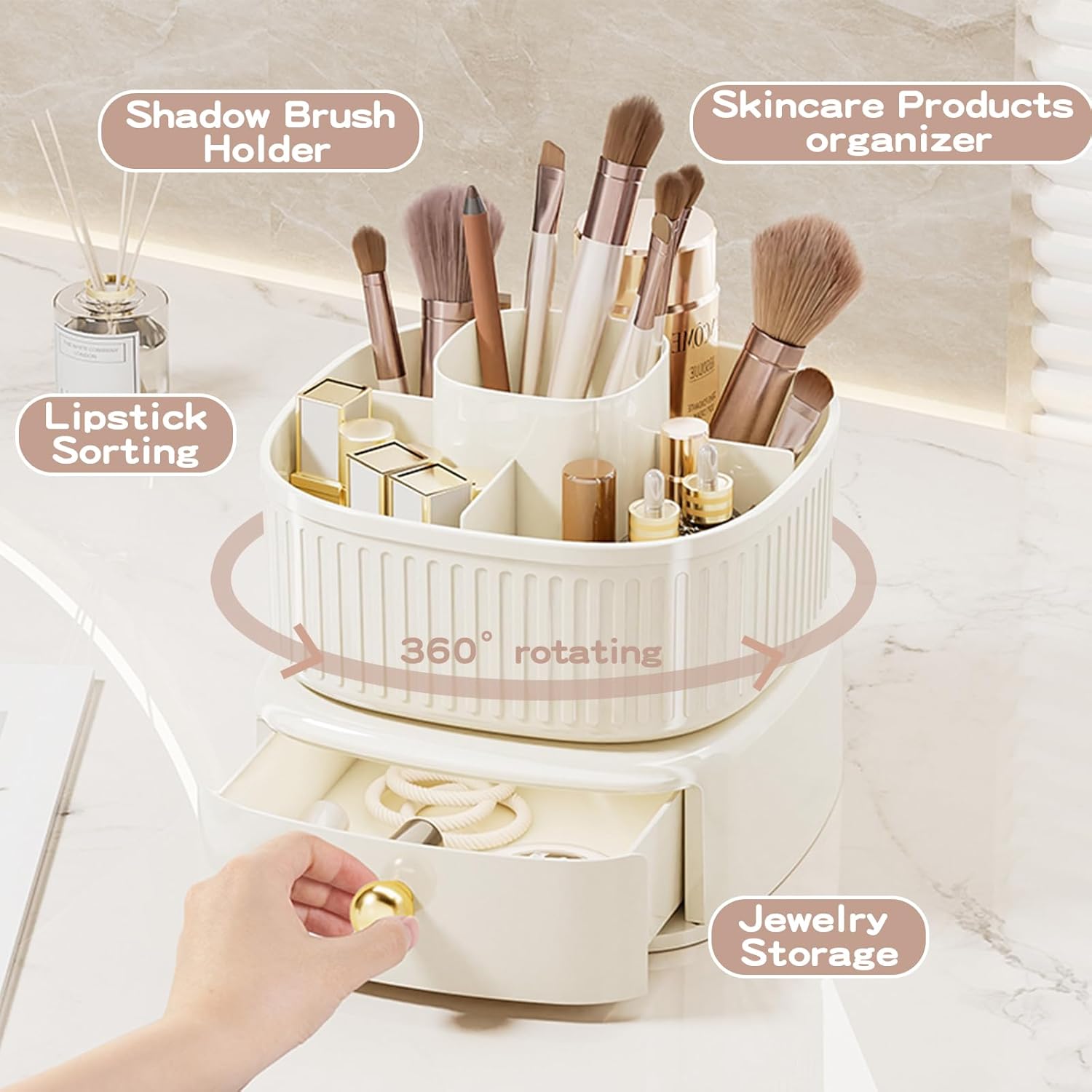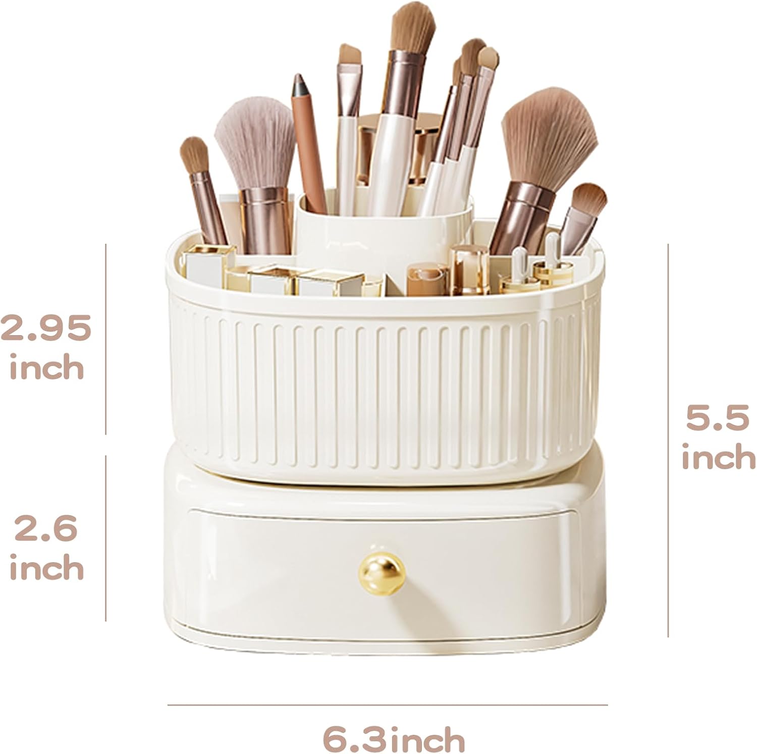 360° Rotating Makeup Brush Holder Organizer with Drawer, Cosmetic Makeup Organizers Countertop, Makeup organization and Skincare Storage for Vanity, Desktop, Bathroom (Ivory)