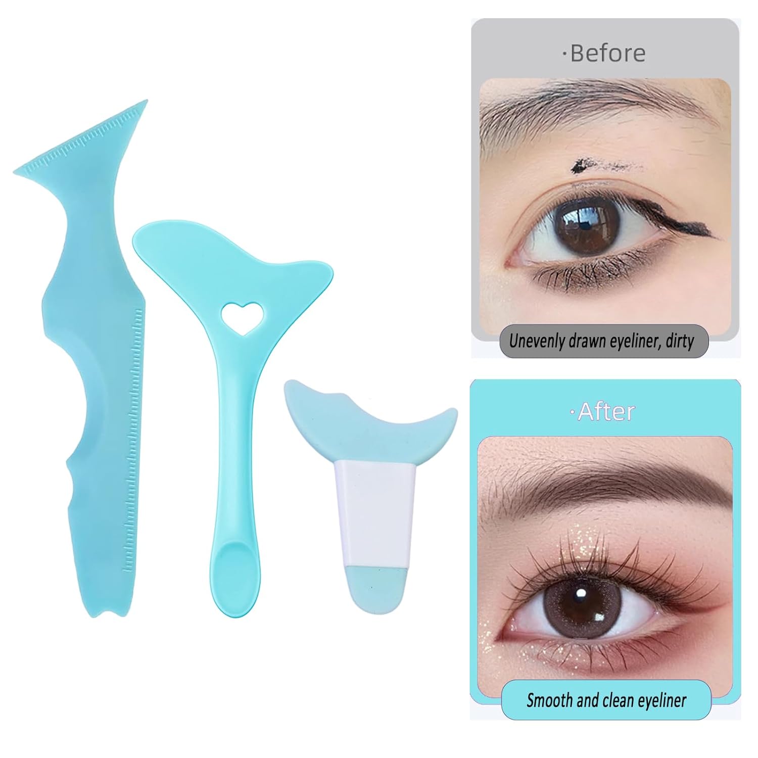 【Multifunctional Makeup Tool】 Eyeliner Aid /Mascara Shield / Eyeshadow Tool / Winged Eyeliner Tool / Lipstick Wear Aid / Eyebrow Aid, it meets all eye makeup styles with different curved eyeliner templates for different eye contours. 3 pieces of eyeliner guides with different curved designs are suitable for beginners and professional makeup users.