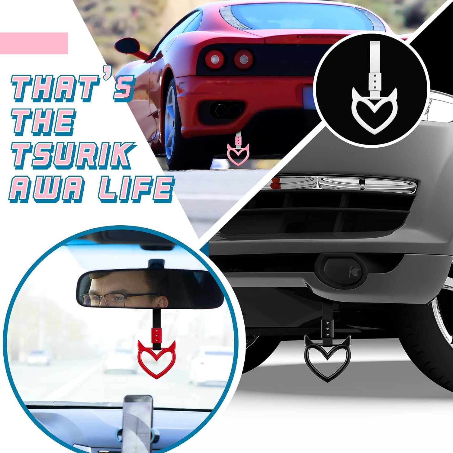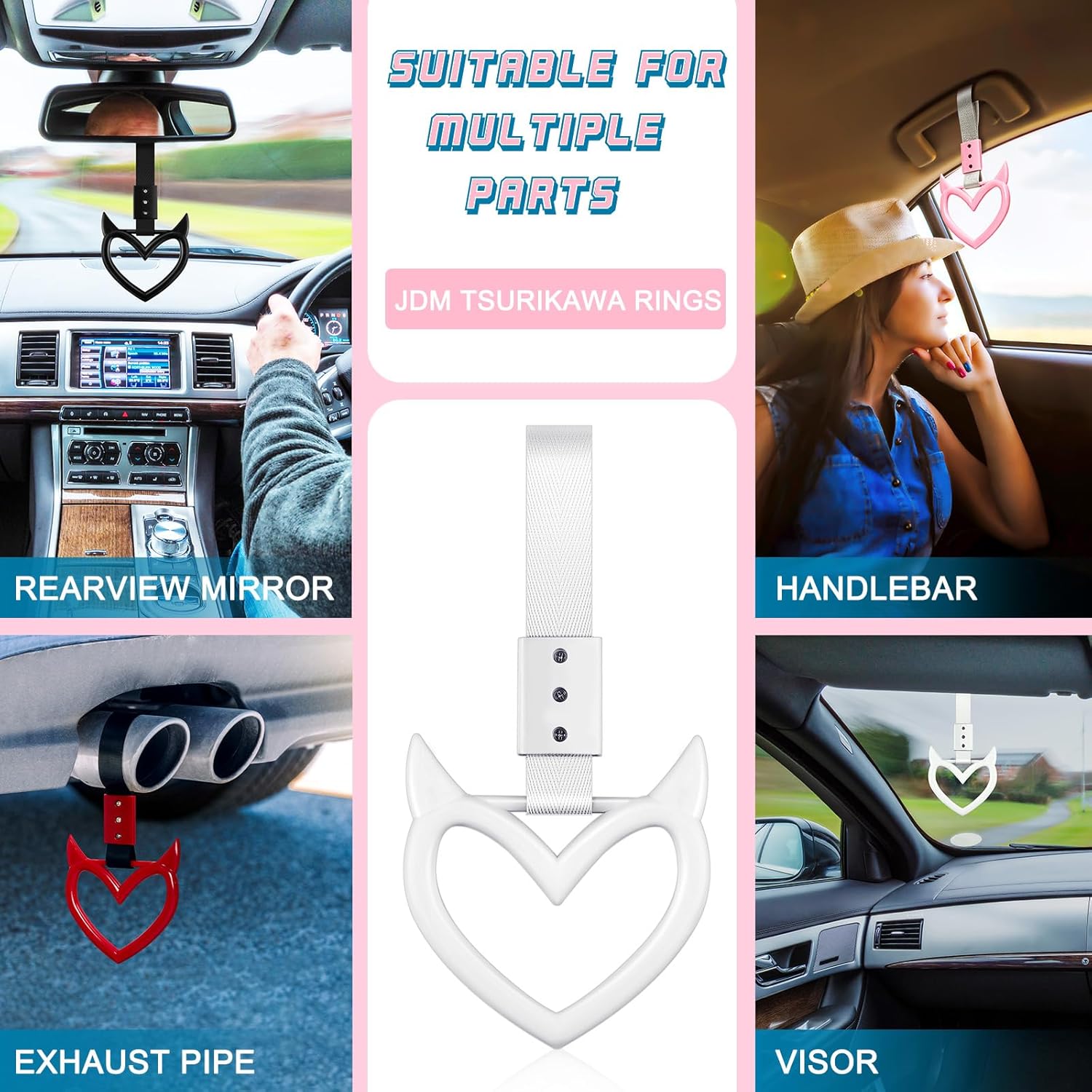 4 Pieces Heart Shaped Car Handle Straps Hang Ring Rear Bumper Warning Ring Decorative Subway Train Bus Handle Hand Strap Drift for Car Interior(Black, White, Red, Pink, Devil)