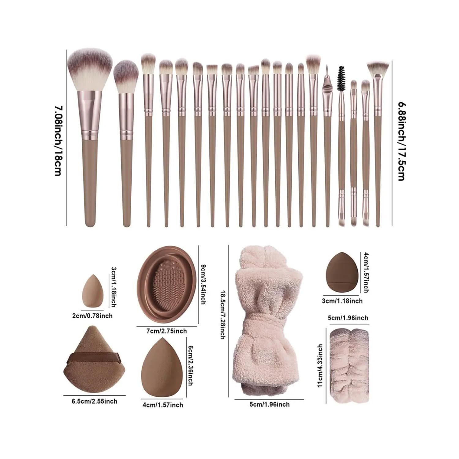 1.40PCS Makeup Tool Set–20pcs Brush &4 Counts Cosmetic Sponges & 4 Counts Mini Sponges & 4 Counts Triangle Powder Puffs & 4 Counts Mini Air Cushion Powder Puff &1 Count Makeup Brush Cleaning Tool & 1 Count Hairband & 2Counts Wrist Band.