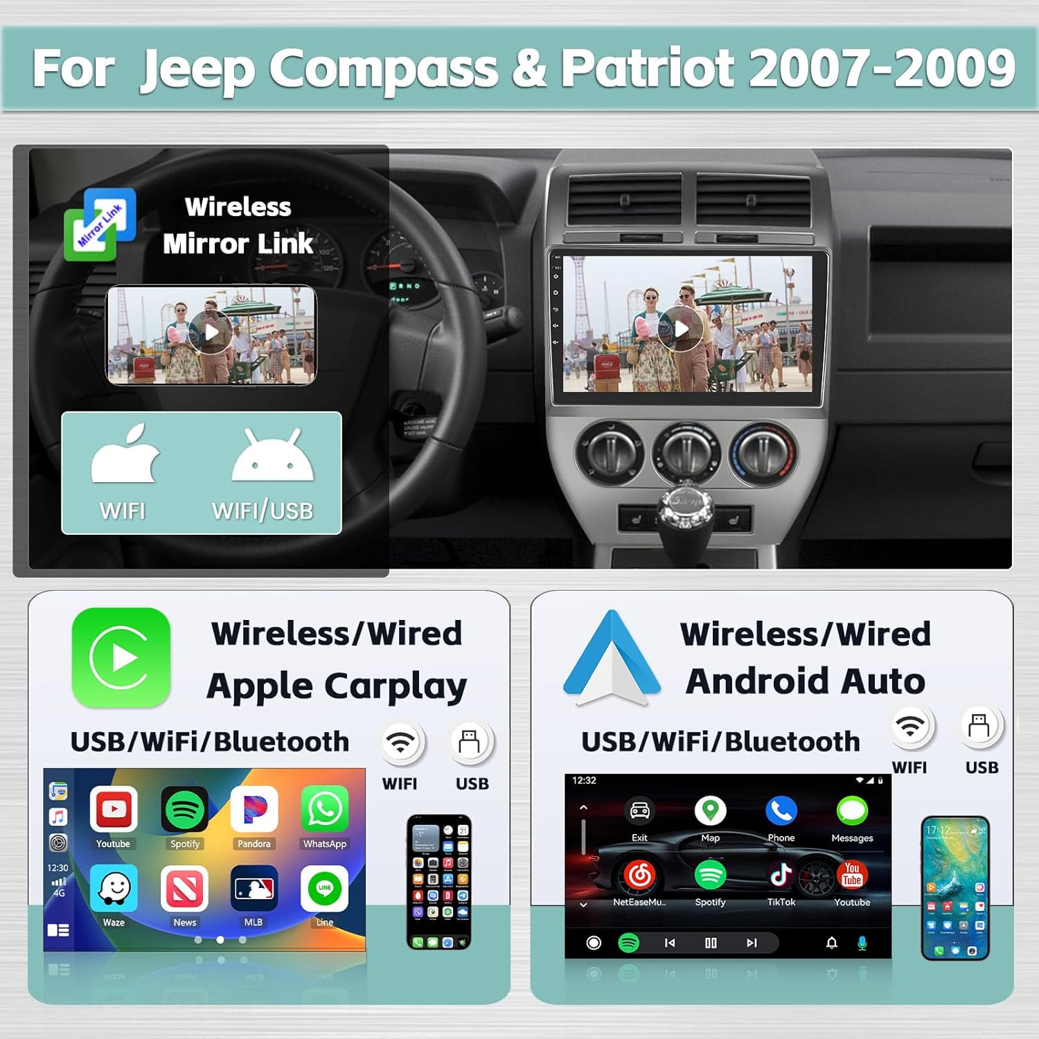 10.1-Inch Android Car Stereo fits for Jeep Compass & Patriot 2007 2008 2009Android car stereo radio with 8 core, 4G RAM and 64G ROMSupport wired and wireless Apple CarPlay & wired and wireless Android AutoVarious EQ settings, support Jazz, Classical, Pop, Rock, Flat, built-in DSP and voice controlEquipped with an AHD backup camera for safe and convenient parkingWith external microphone input, subwoofer output, dual rear USB input, compatible with USB DVRConnect WiFi or Hotspot, you can download your favorite APPs, check the weather, get live news or watch online videos, etc