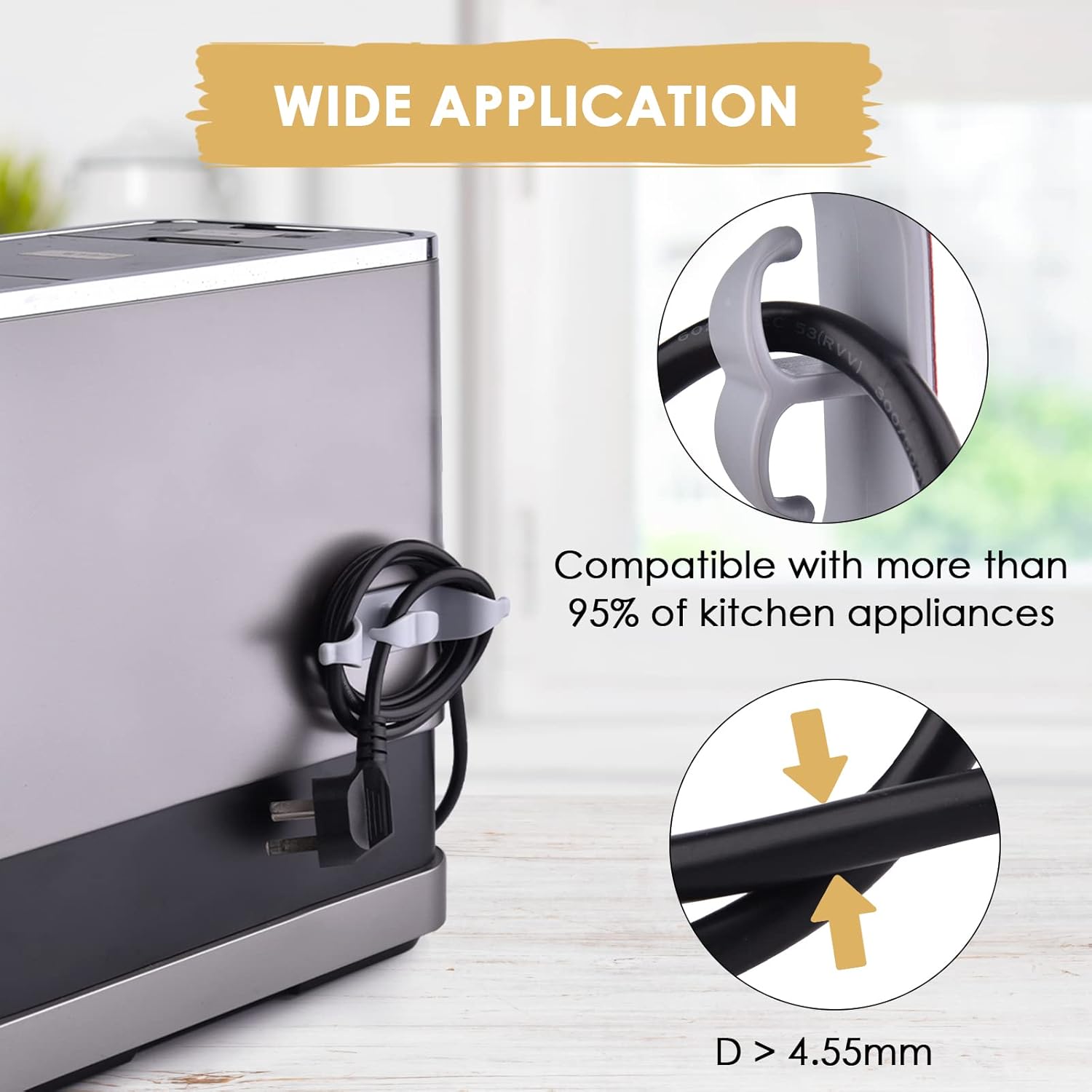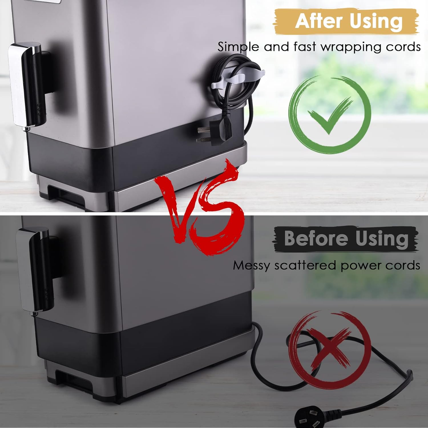 【PREMIUM MATERIAL】 Cord organizers is made of high quality rubber, durable and deformation resistant. The sticky adhesive pad is non-toxic, odorless, and will not leave marks on kitchen appliance surface.