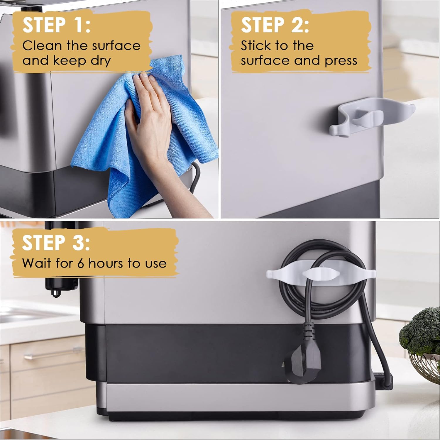 【EASY TO INSTALL】 The glue at the bottom is a high-quality glue selected, which is not easy to fall off. Wipe clean, remove any grease, dust or oil on appliance before applying our kitchen appliance cord winder, place 6hrs before using for better effect.