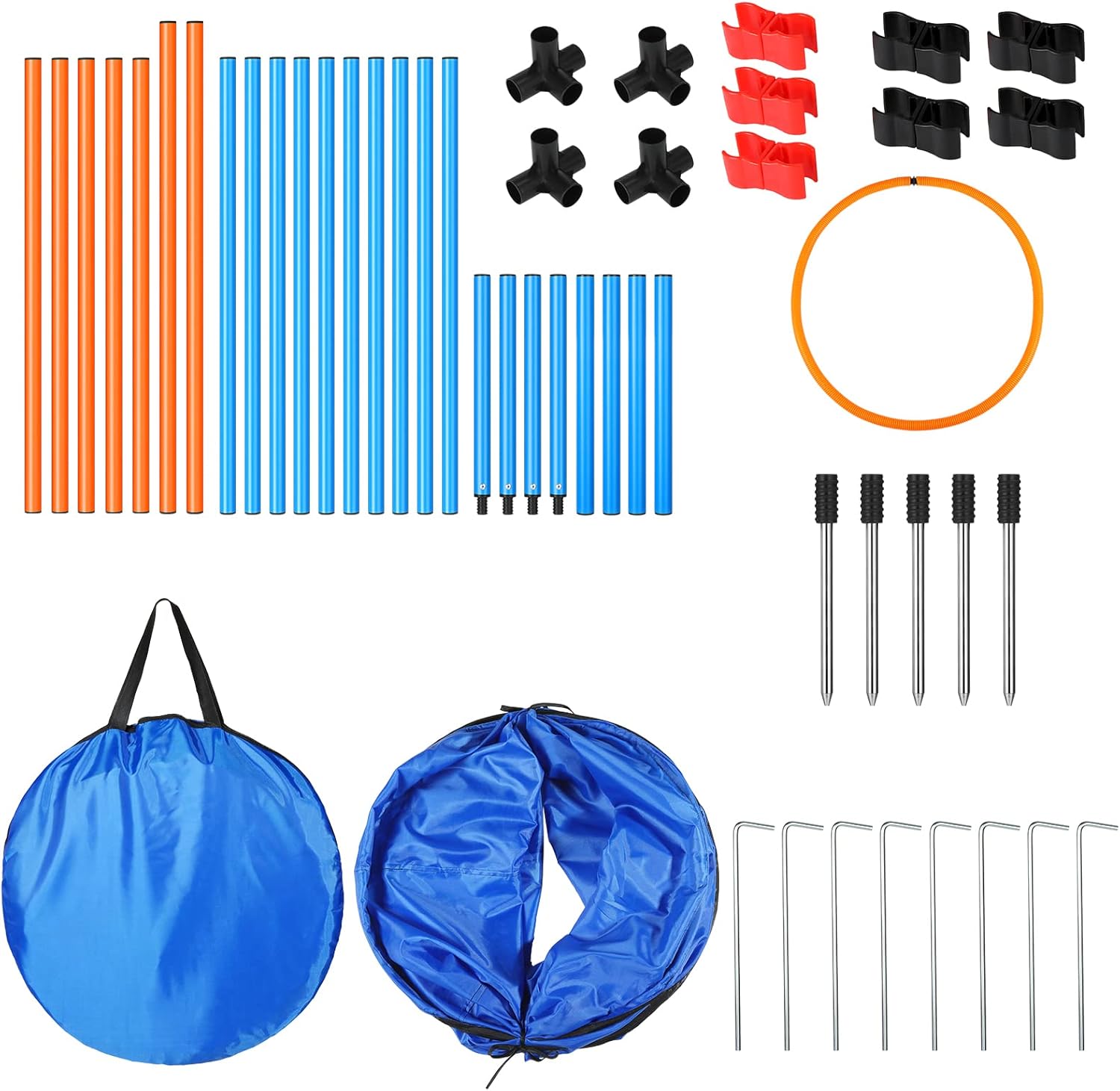 You Will Get: there are 5 sets of dog agility training tools, including pause box, dog tunnel, agility hurdles, agility poles, and dog agility hoop, coming with 2 carrying bags and manual, bringing more convenience for your dog training