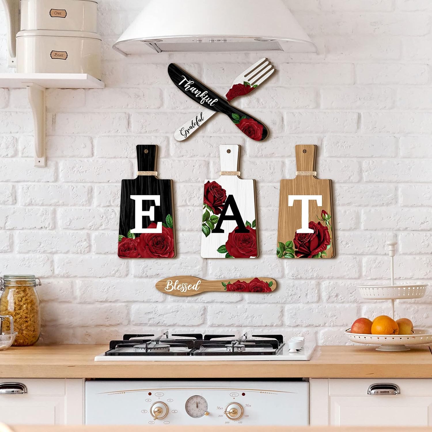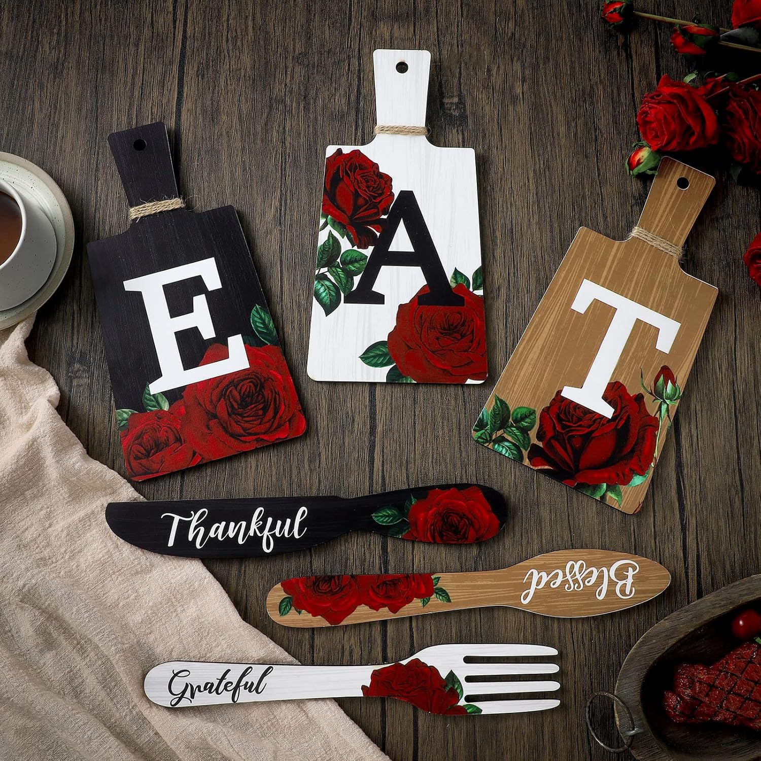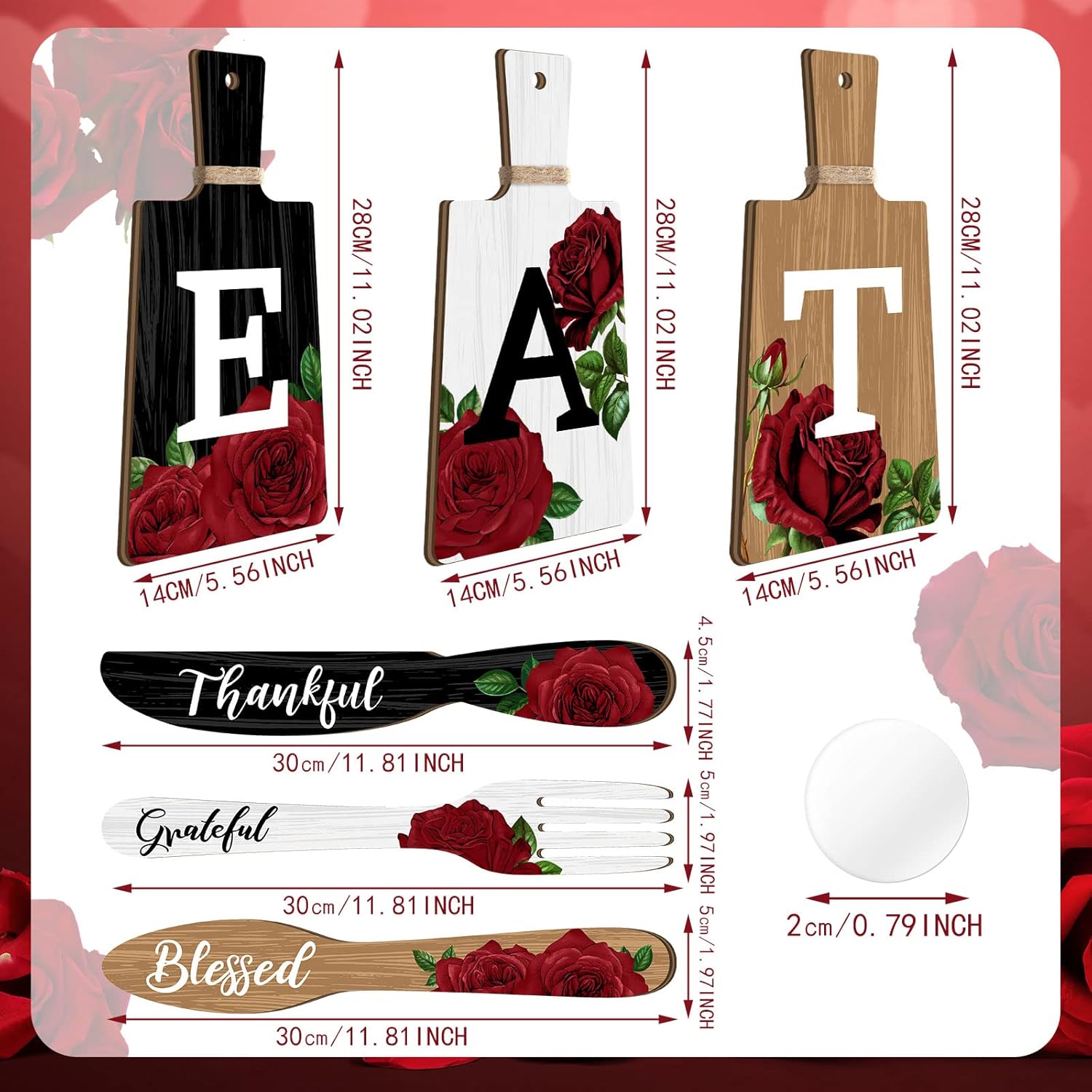 6 Pieces Cutting Board Kitchen Decor Red Rose Eat Sign Set Wooden Kitchen Knife Fork Spoon with Thankful Grateful Blessed Hanging Sign Rustic Farmhouse Wedding Wall Art for Wedding Home Decoration