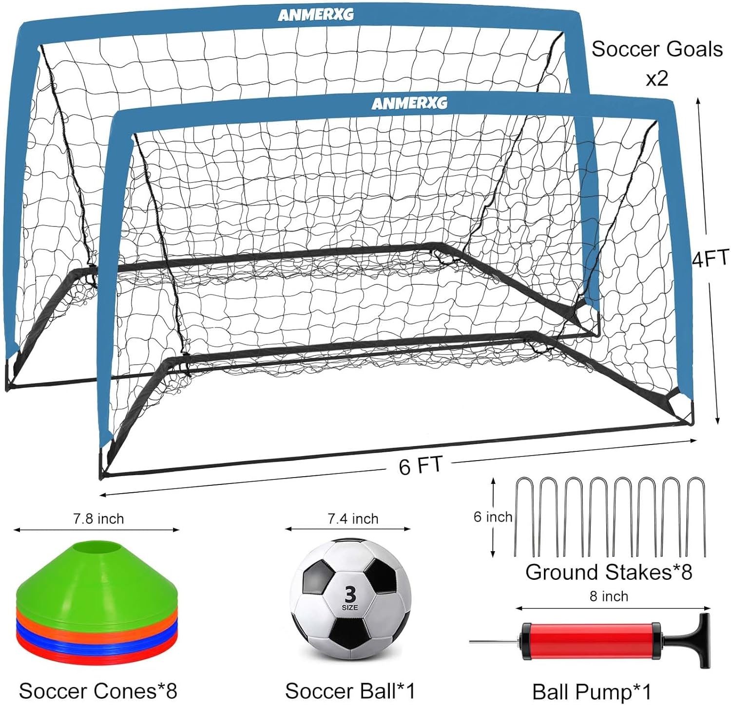 ANMERXG presents a premium 6×4 ft pop-up soccer goal designed for superior quality and durability. Crafted with robust materials, including 420D thickened Oxford cloth, 10MM high-elastic fiberglass poles, and a sturdy 3-layer PE soccer net with reinforced inner bungee cord, these soccer goals ensure all-weather resilience. The set includes a durable TPU standard size 3 soccer ball. Effortless assembly is facilitated by a user-friendly design, making it suitable for kids. Soccer goal for kids ages 3-5 6-10 8-12 12-14, this soccer net set promotes teamwork, motor skills, and coordination development, offering endless hours of entertainment for players of all ages and skill levels.