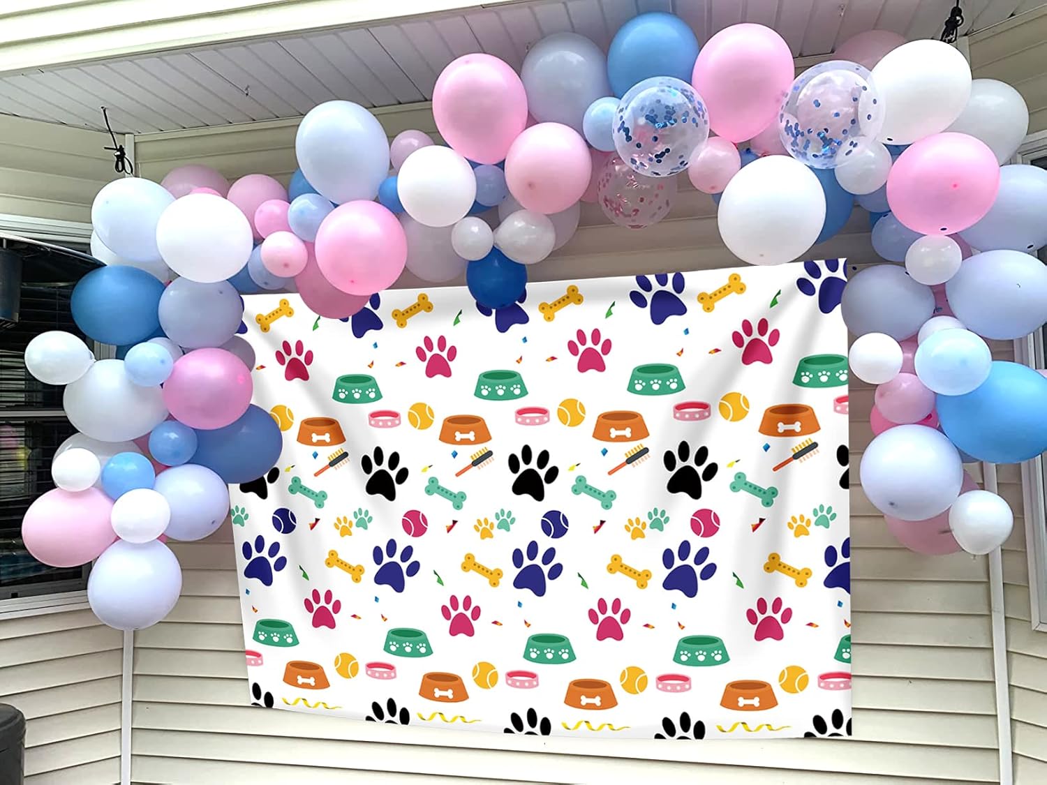 7x5FT Colorful Dog Cat Footprints Backdrop Let’s Paw-ty Pet Paw Print Bone Toy Ball Background Pet Cat Dog Treat Birthday Party Supplies Banner
