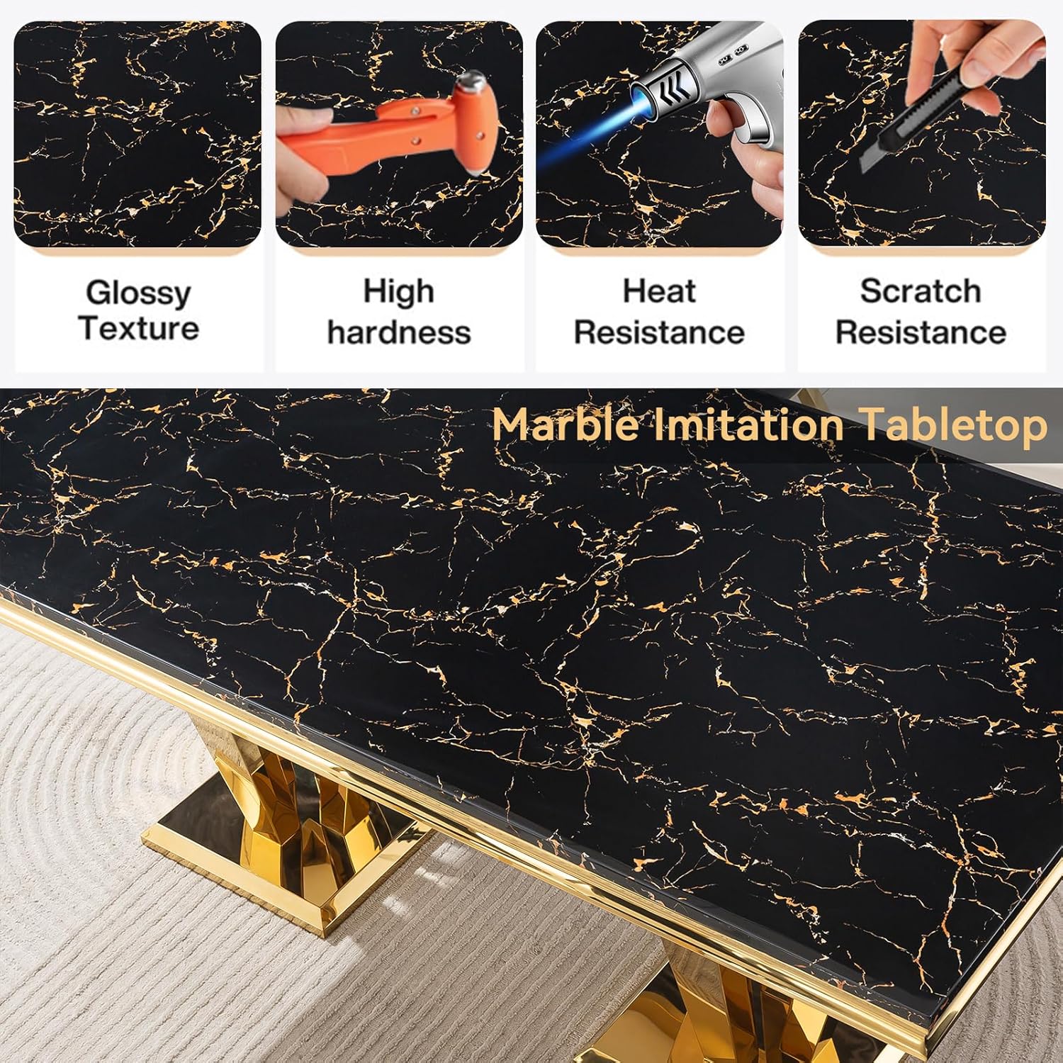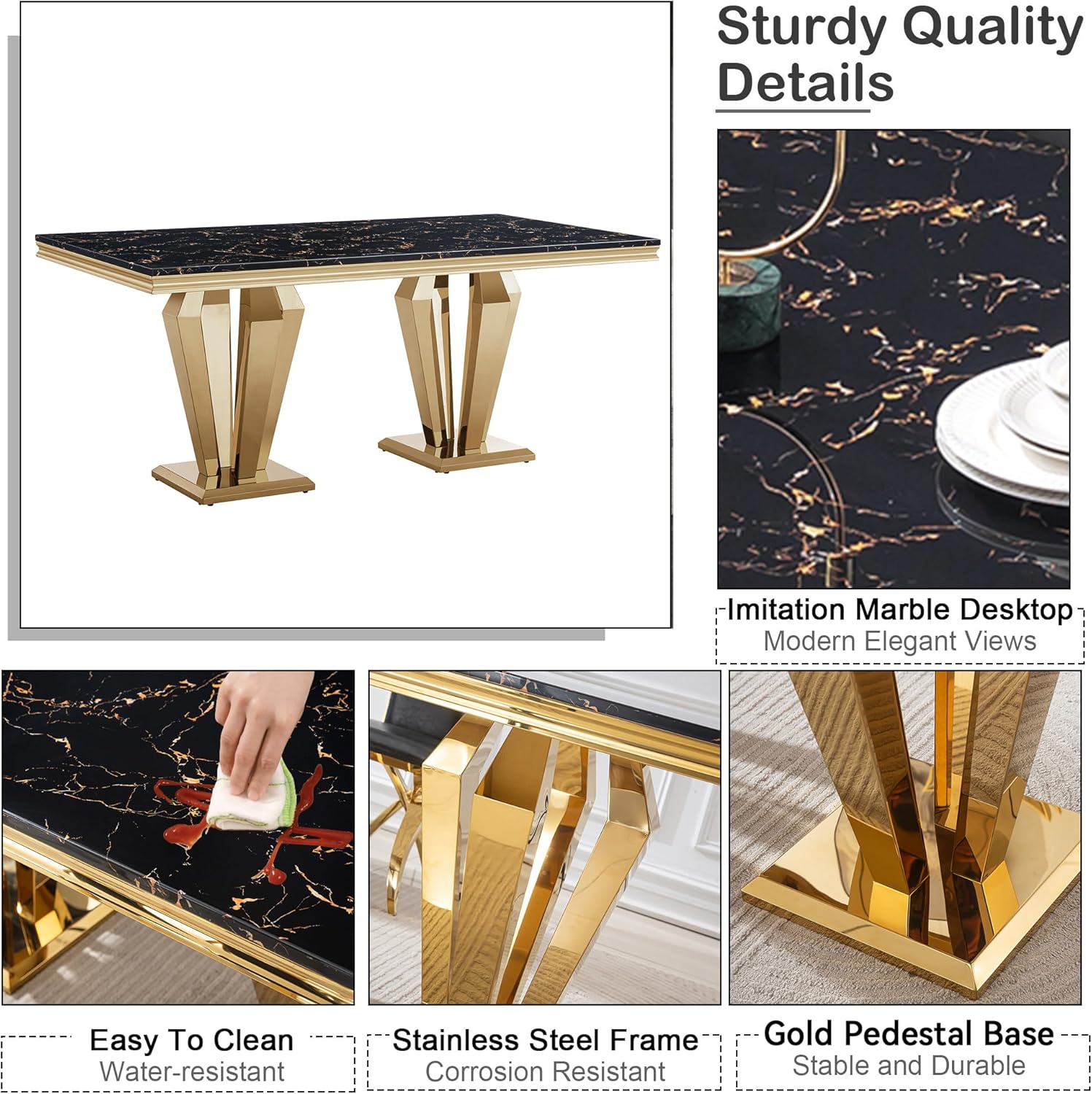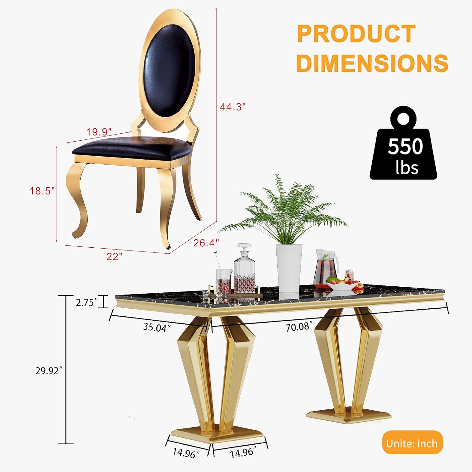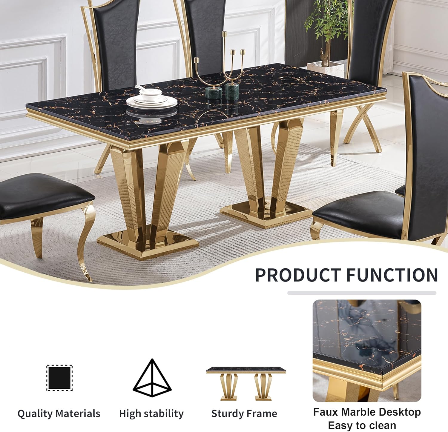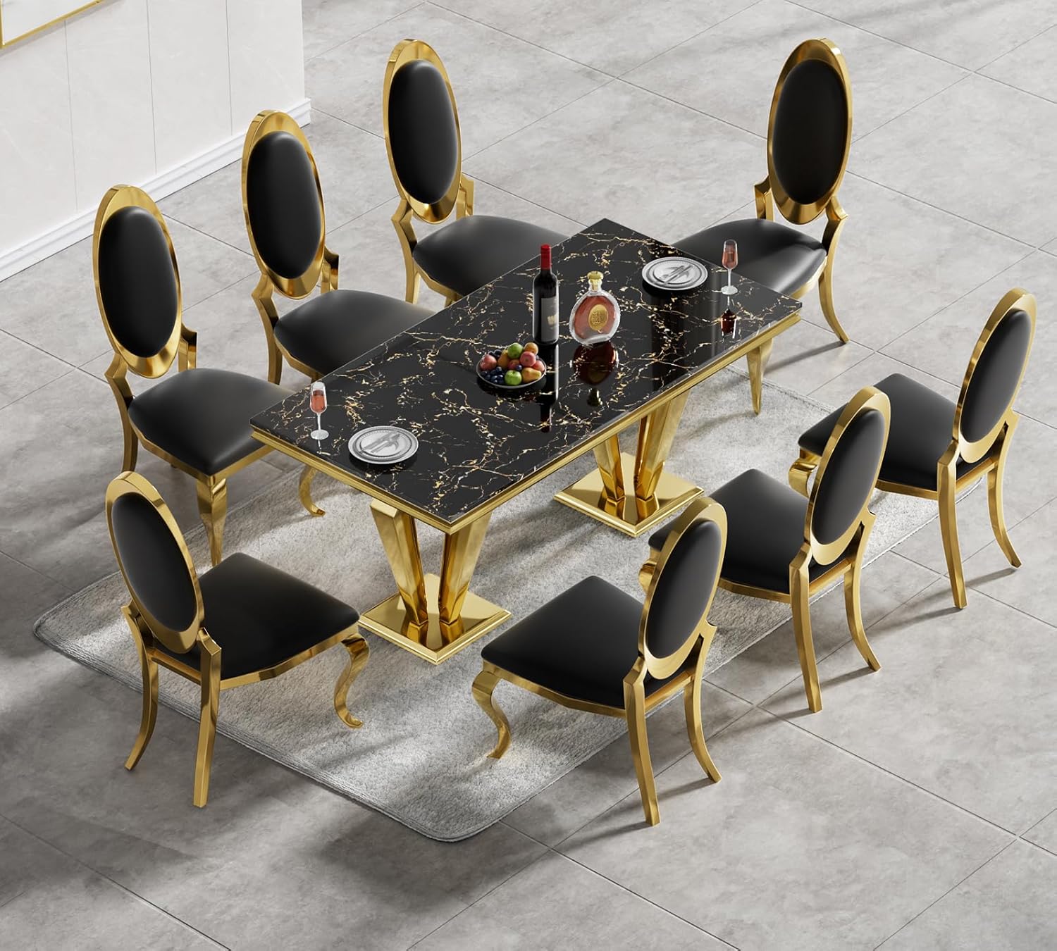 ➤【Luxury 9 Piece Dining Table Set】- Complete 9 pieces dining set consisting of 1 black faux marble table and 8 leather upholstered chairs which makes it perfectly sized for a dinette, kitchen, or any dining area. This marble texture top dining table with gold mirrored finish stainless steel pedestal base will add elegance to your dining room while its ultra-modern design can easily blend in with any home decors.