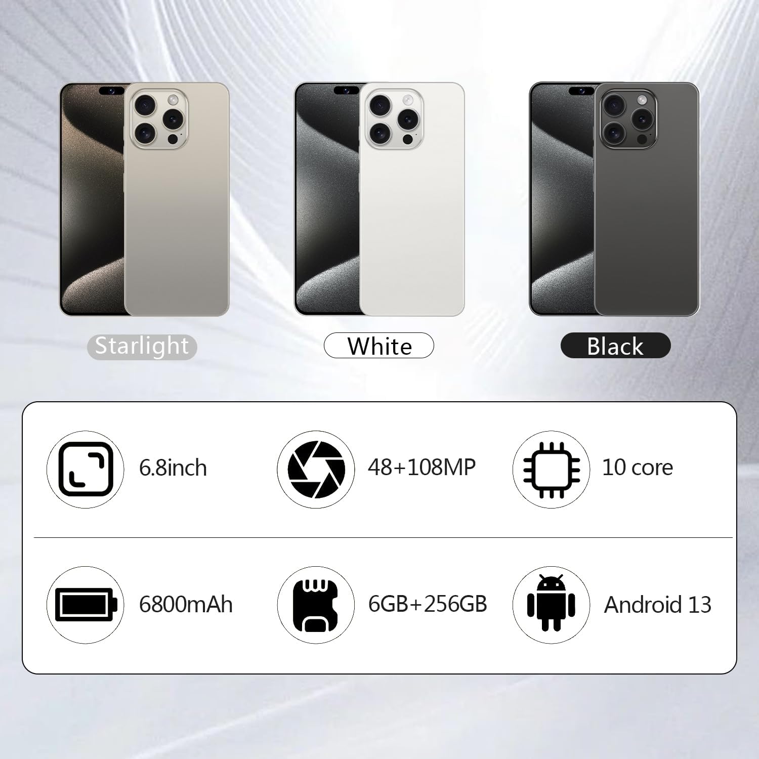 A15 Pro Max Unlocked Cell Phone, 6GB+256GB Unlocked Smartphone, 6.82″ HD Android 13 Unlocked Phones, 6800mAh Battery/108MP Camera/Face ID, Dual SIM 5G Phone (Black)