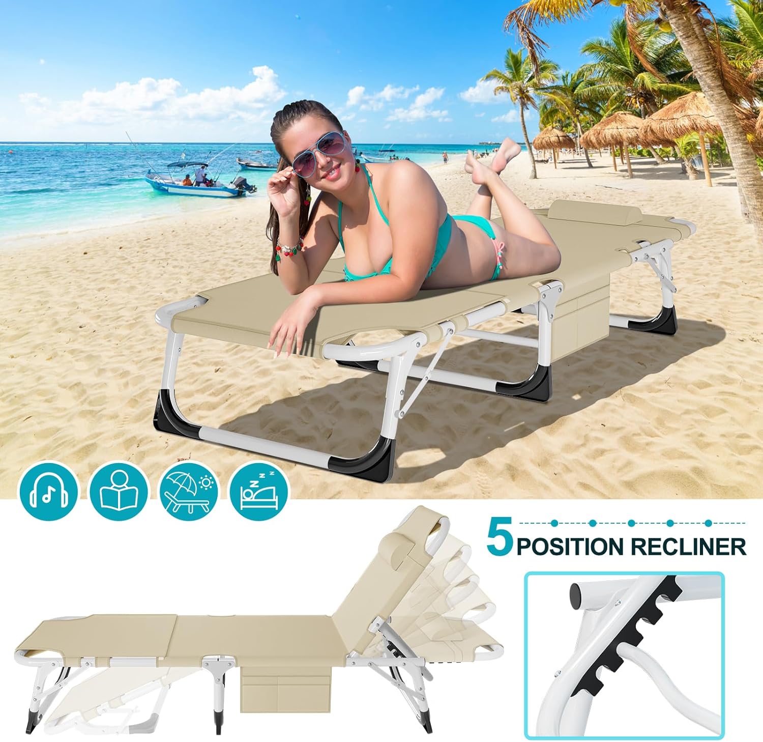 【Comfortable Outdoor Bed】: Spacious and comfortable folding chaise lounge chair suitable for individuals up to 6.2 feet, designed with breathable fabric and ergonomic features to reduce muscle tension.
