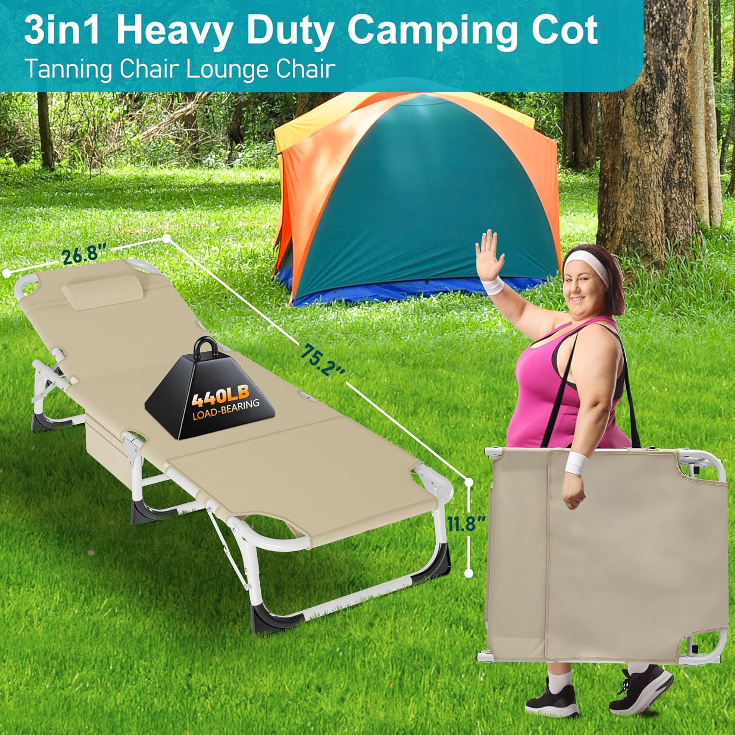 【Camping Cot with Face Hole】: Versatile camping cot with customizable features including an adjustable face hole, arm slots, and a pillow for sunbathing, camping, or guest use.