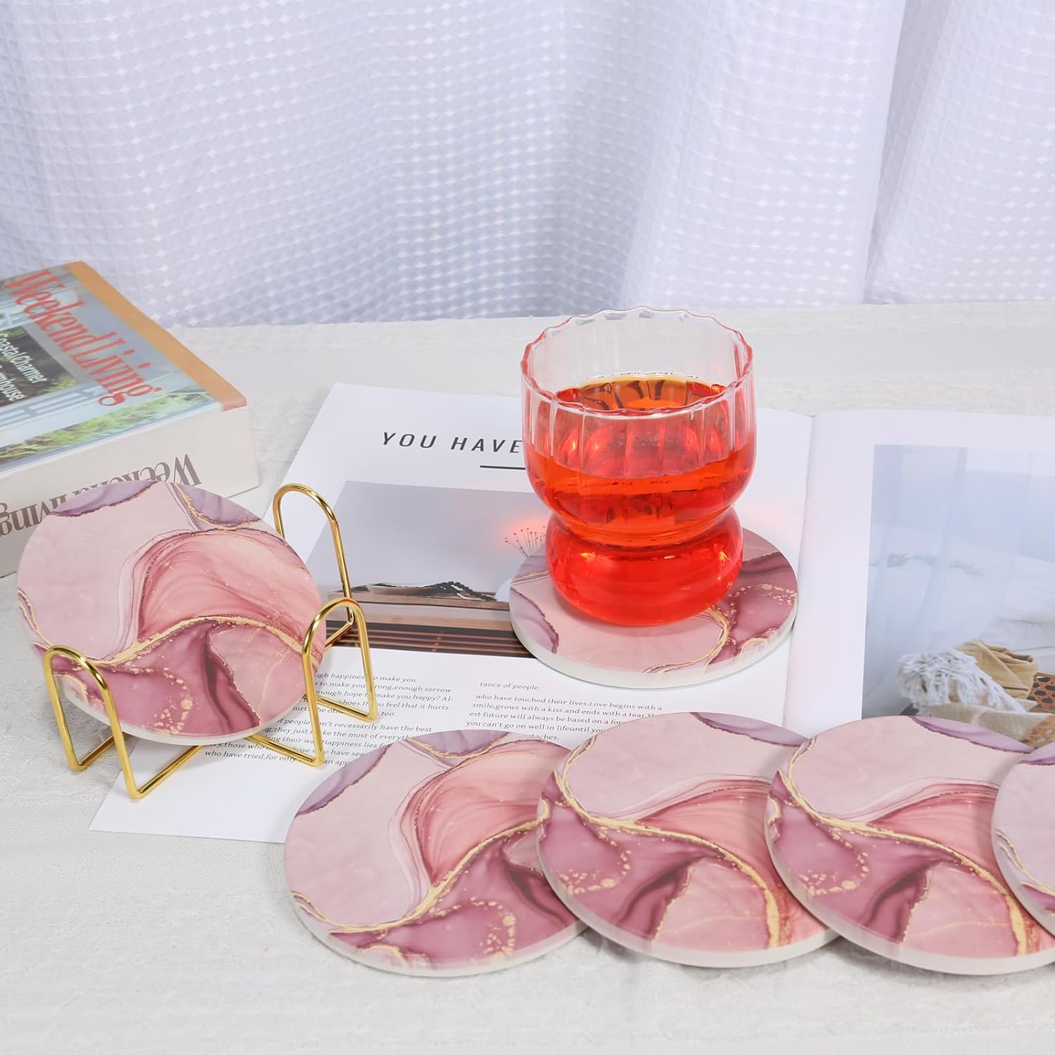 Absorbent Pink Marble Ceramic Coasters for Drinks with Gold Holder and Cork Base Set of 6 Round Decorative Tabletop Protection for Coffee Table Bar Kitchen Home and Dining Room