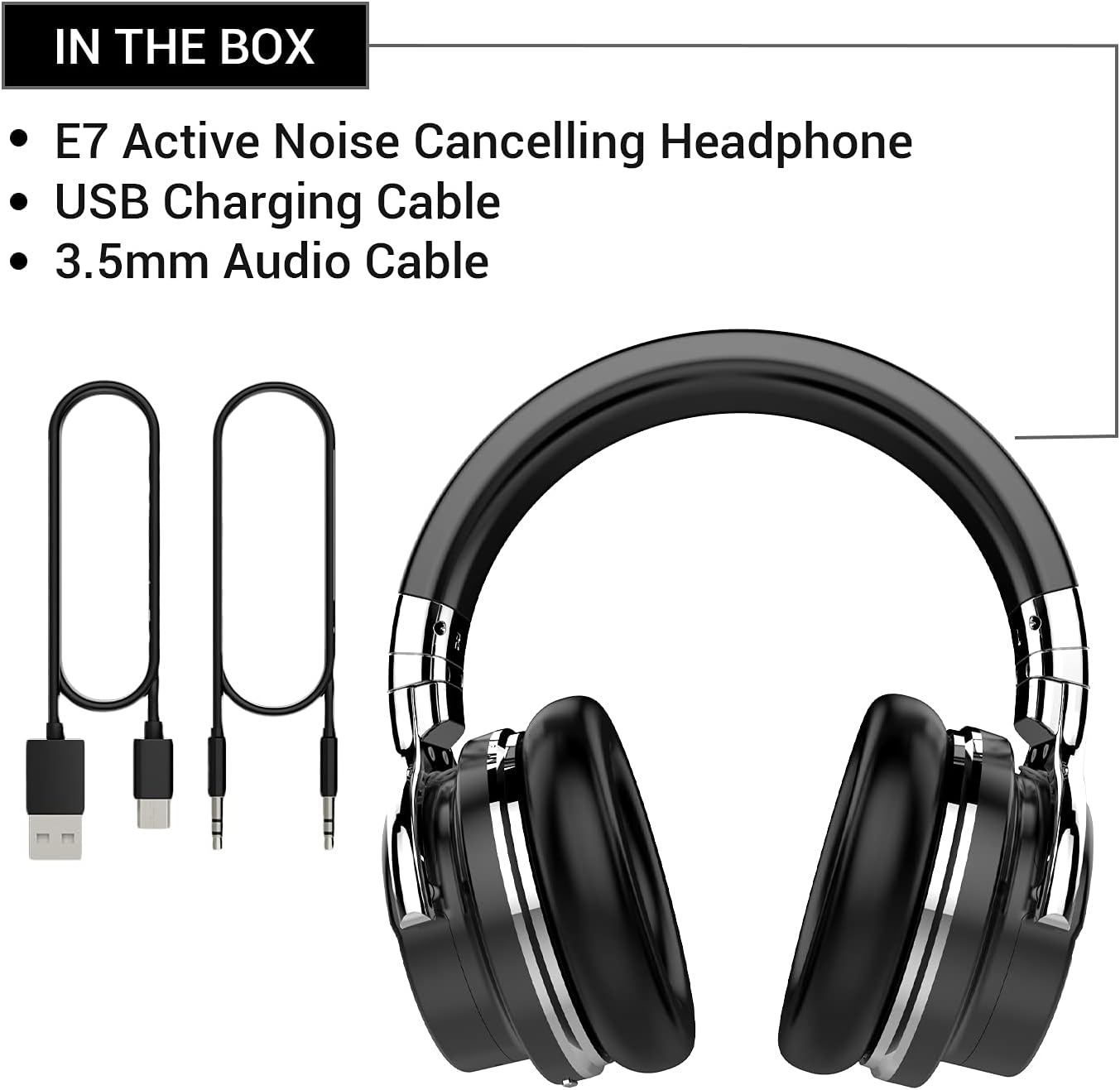 Active Noise Cancelling Headphones, E7 Bluetooth Headphones with Microphone Deep Bass Wireless Headphones Over Ear, Comfortable Protein Earpads, 30 Hours Playtime for Travel/Work, Black