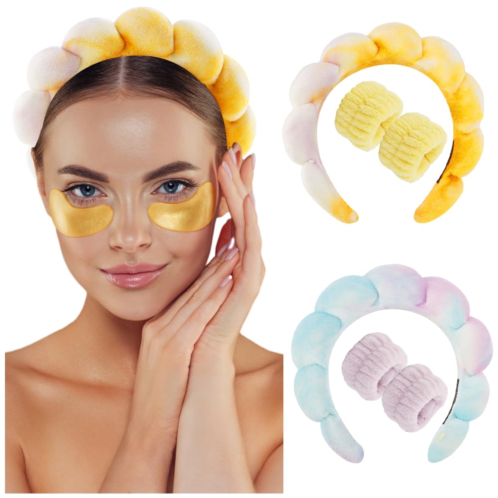 AHONEY 2 Set Skin Care for Kids Teen Girls Women, Spa Headbands for Washing Face Wristband, Sponge Facial Skincare Headbands Terry Cloth Puffy Makeup Accessories (Tie dye)