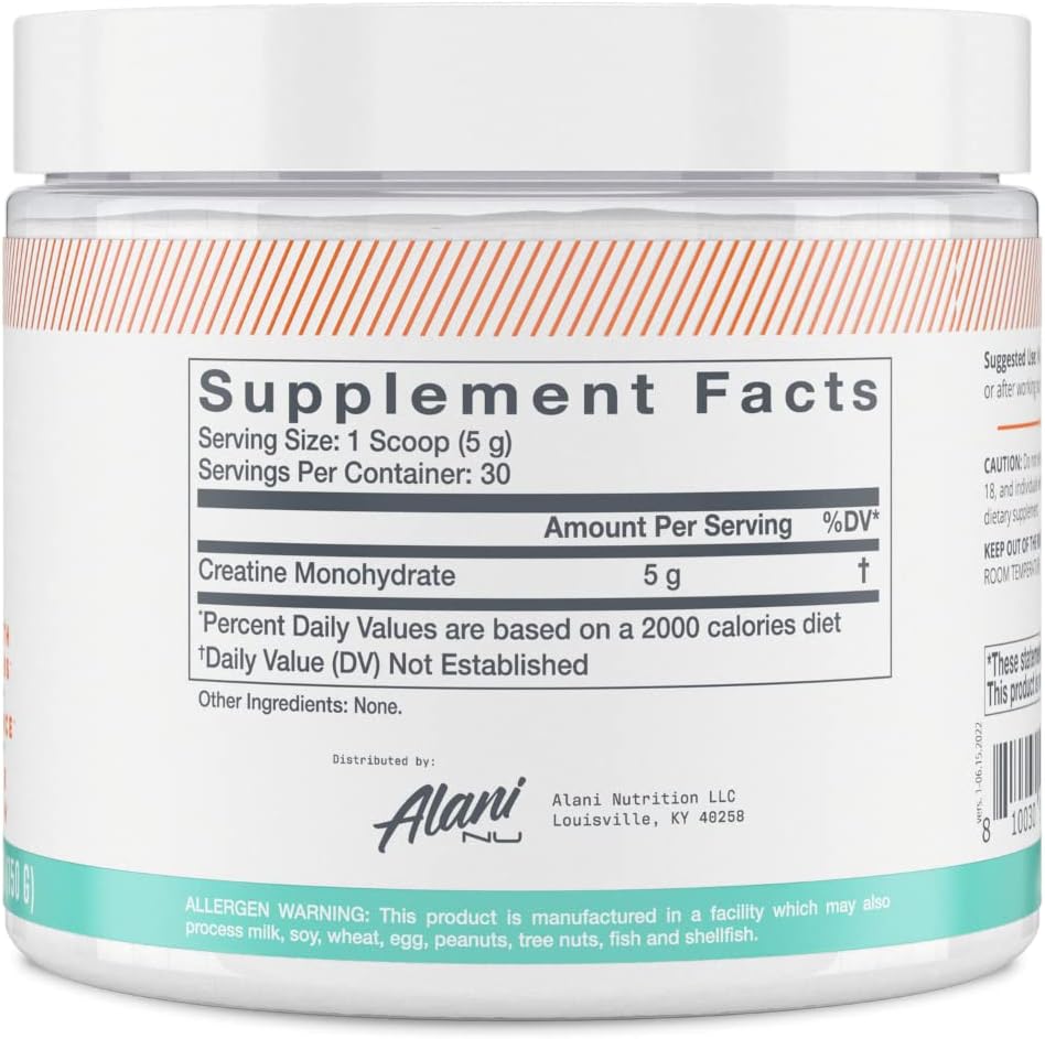 PURE CREATINE POWDER: Alani Nu Creatine is just that – only creatine. No fillers or other unnecessary ingredients, because we care about what we put in your body as much as you do. Suggested Use: Mix 1 scoop (5g) of creatine in 8-12 oz of water or any flavored beverage. Take before or after working out. On rest days take before or after consuming a meal.