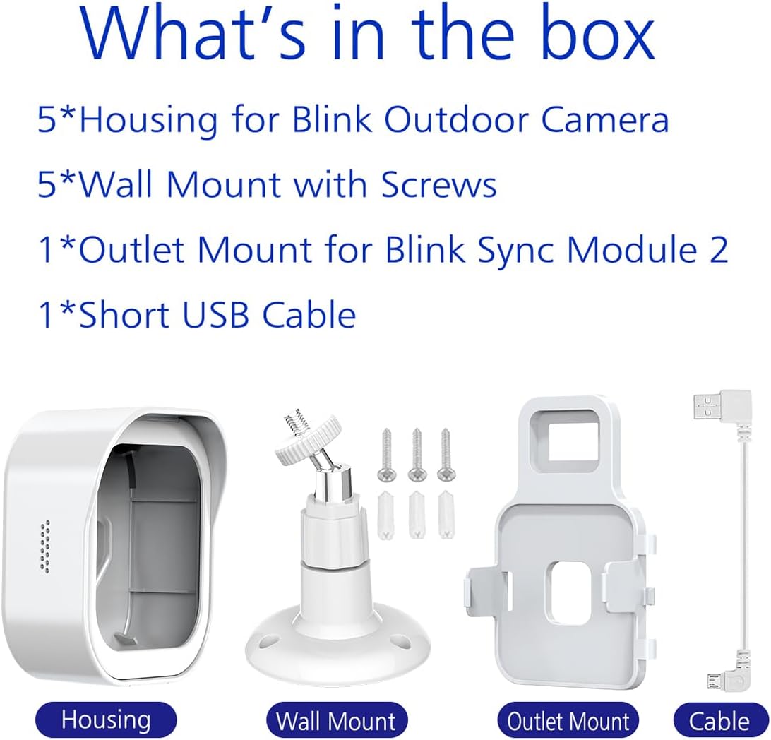 [Package and Service] – 5*weatherproof housing, 5*Blink outdoor wall mount, 1 outlet wall mount for Blink sync module 2, 1*customized short USB cable and various installation accessories. If you have any questions about our products, please contact us, we sincerely hope every customer can enjoy shopping.