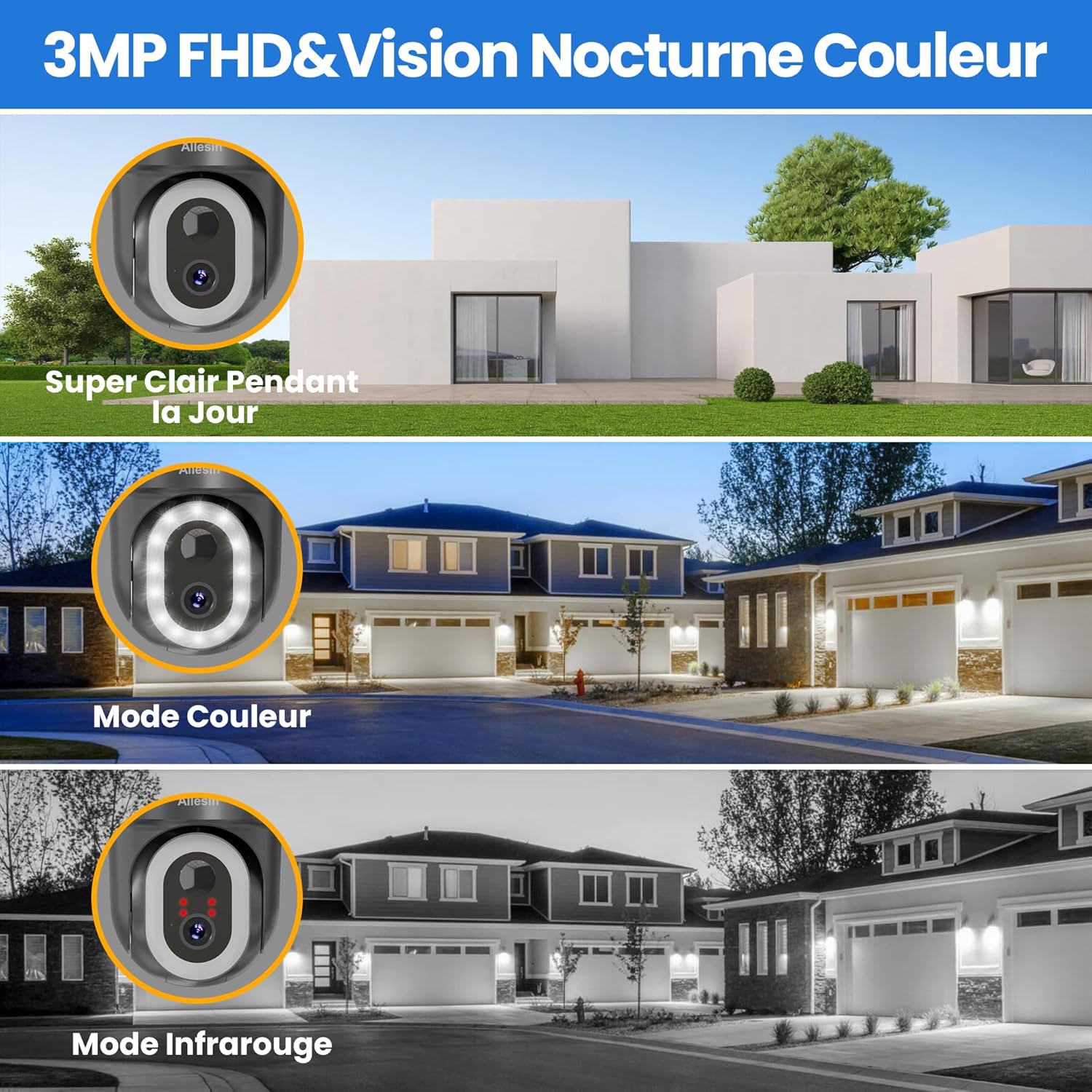 Allesin Solar Security Camera Wireless Outdoor, 3MP Sloar Cameras for Home Security with 14LEDs Spotlight Color Night Vision, 2.4GHz WiFi, AI Human Detection, 2-Way Talk, Cloud/SD Storage, Black