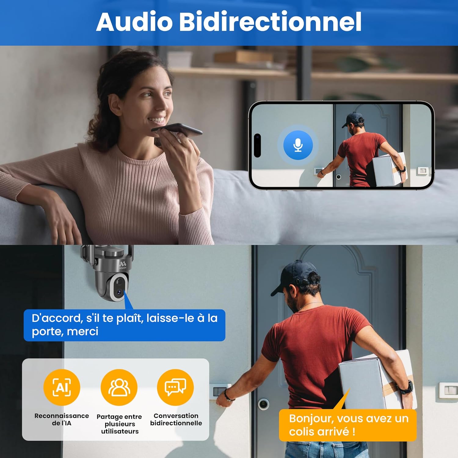 📹️【Two-Way Audio 】- Built-in speakers and noise-canceling microphones allow you to have real-time conversation with couriers, or use it to warn off the suspicious. , volume adjustable.