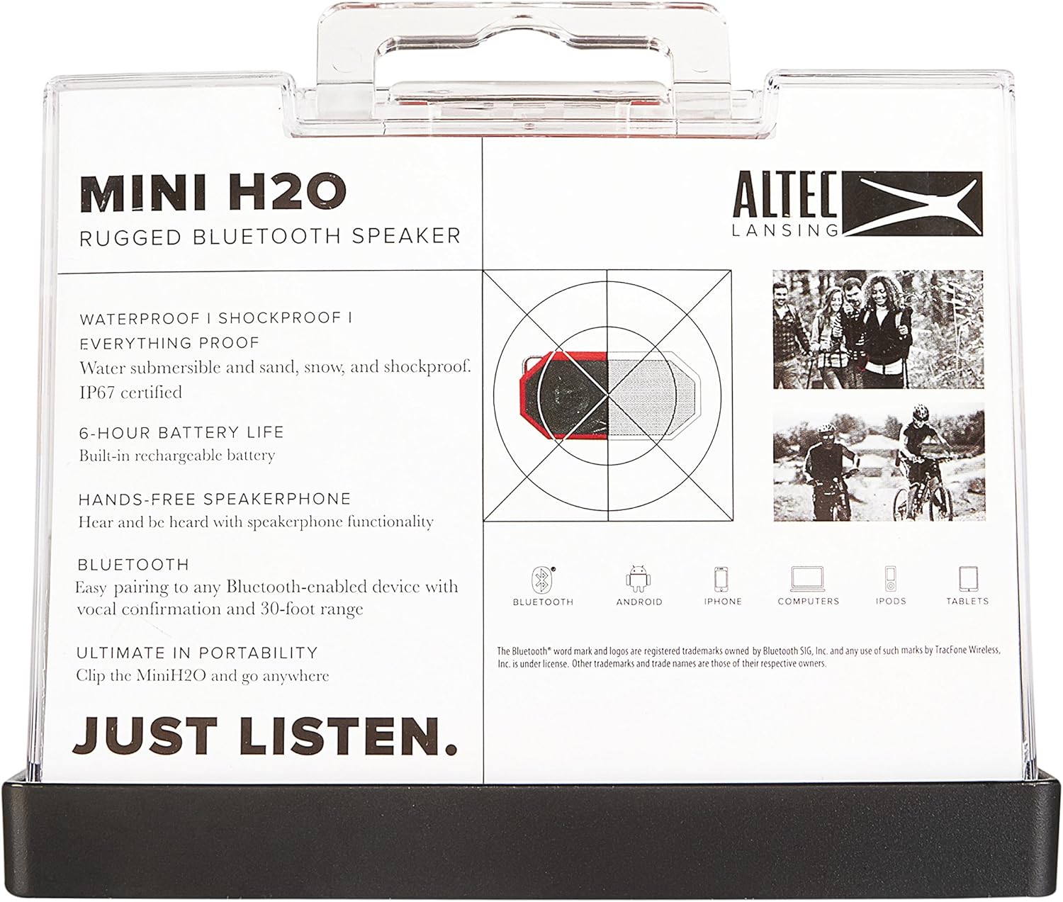 An energy-sipping lithium-ion battery delivers up to 6 hours of music, podcasts and audio books on a single charge. The Mini H2O Bluetooth Speaker comes with its own USB charging cable, auxiliary cable and quick-start guide to get you off the couch and into the groove.