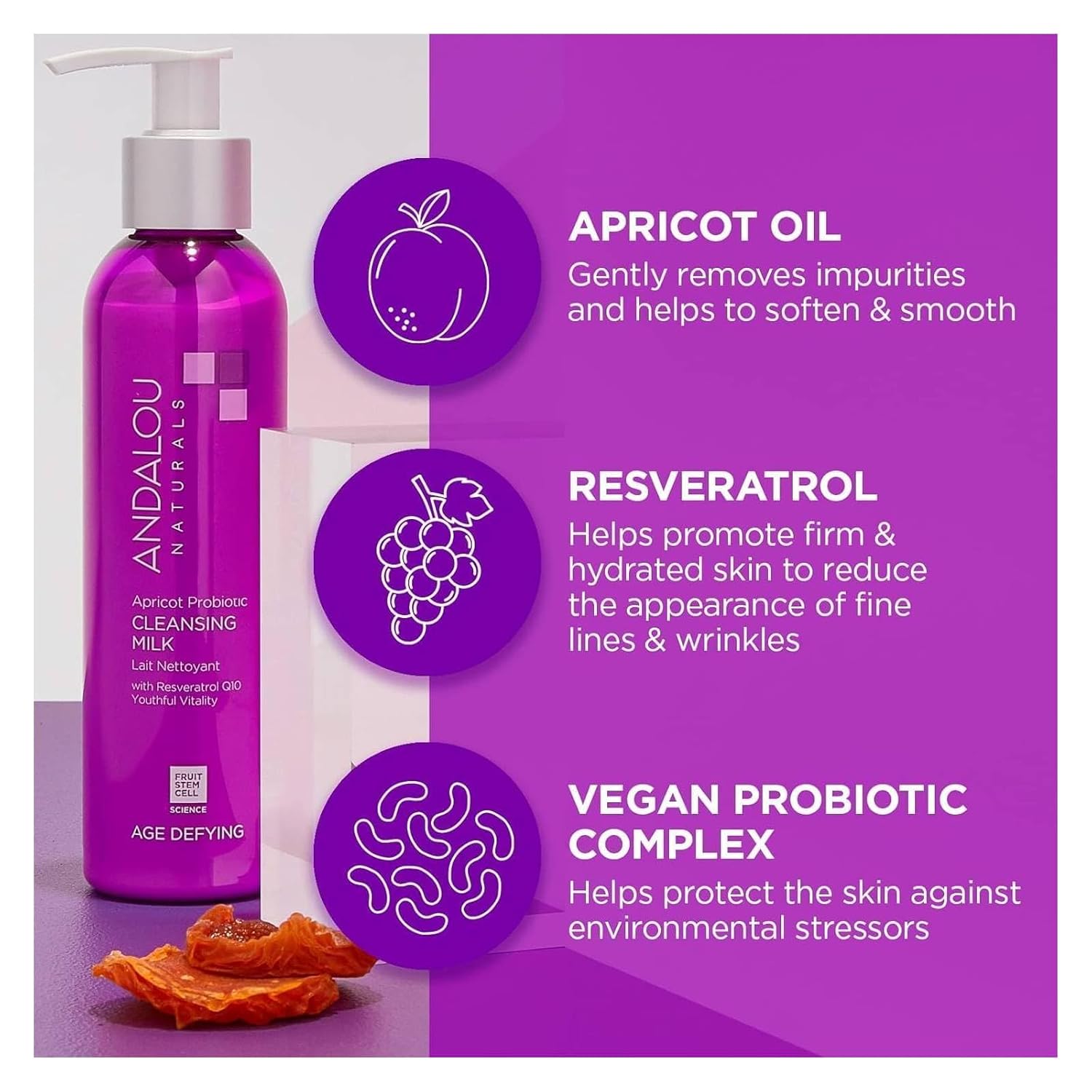 Andalou Naturals Apricot Probiotic Cleansing MilkAndalou Naturals Apricot Probiotic Cleansing Milk combines the power of probiotics, resveratrol CoQ10, blended with apricot and borage oils, to effortlessly cleanse makeup and impurities without stripping the skin. Formulated with a potent Fruit Stem Cell complex derived from apple and grape, along with Resveratrol CoQ10 and vegan probiotics, this cleansing milk gently removes dull surface cells while restoring the natural balance of your skin’s microflora.